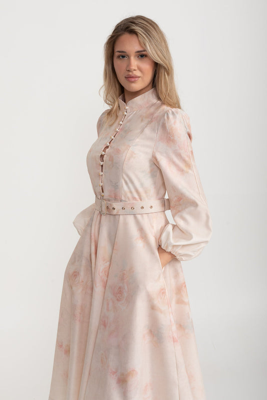Suluboya Çiçekli Kemerli Midi Elbise Mandarin Yakalı