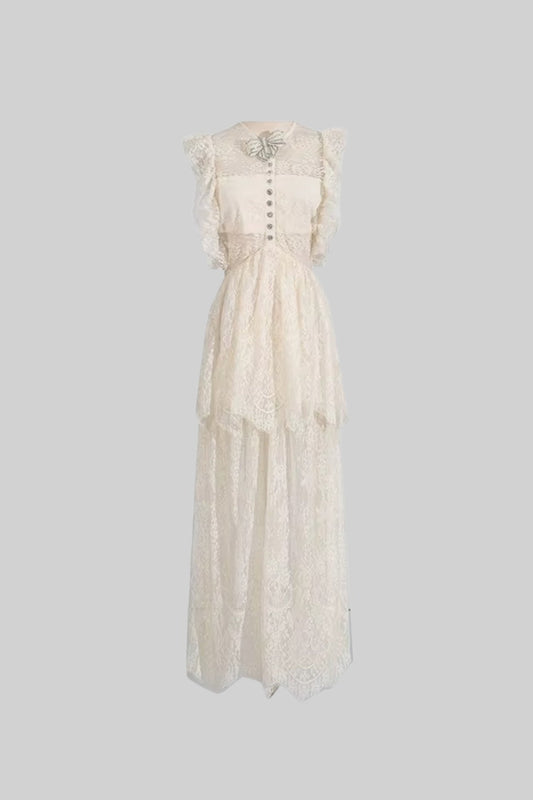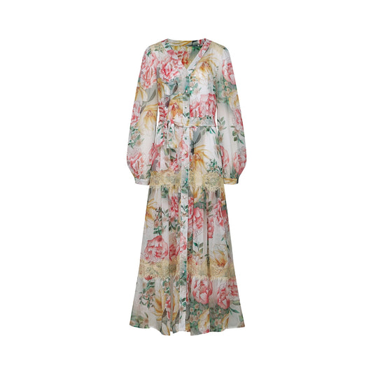 Émeline Çiçekli Dantel Kloş Manşetli Maksi Elbise