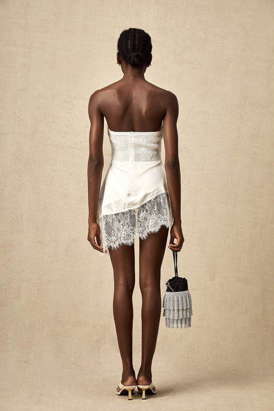 Éliane Beyaz Dantel Drapeli Asimetrik Mini Elbise