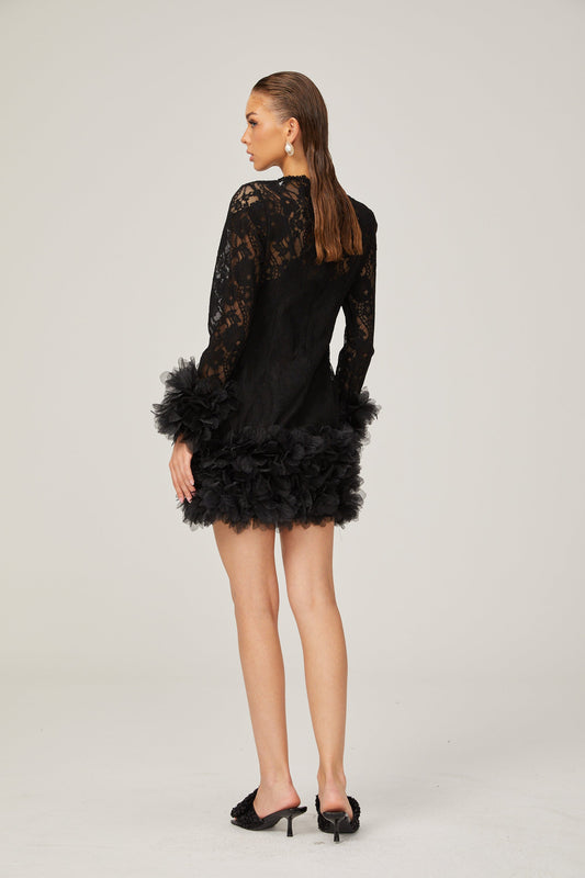 Siyah Camille Dantel Katman Tüy Şeritli Mini Elbise