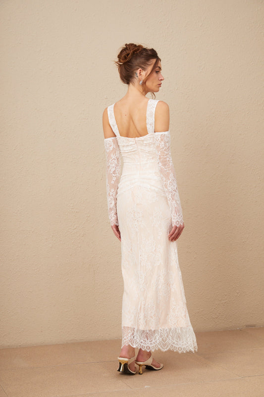 Kiraz Beyazı Açık Sırtlı Çiçekli Dantel Midi Elbise