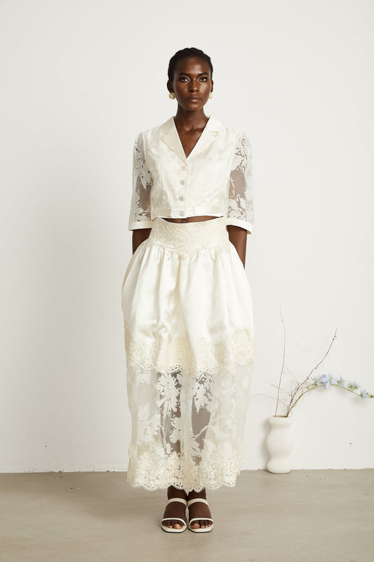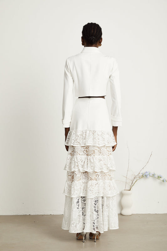 Zélie Beyaz Dantel Panelli Ceket Ve Etek Kombin Seti