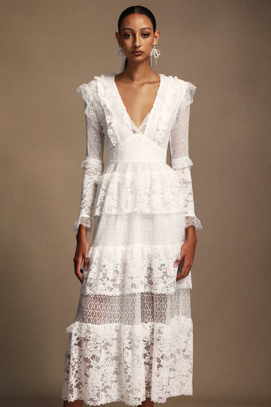 Solvia V Yaka Uzun Kollu Katmanlı Dantel Midi Elbise