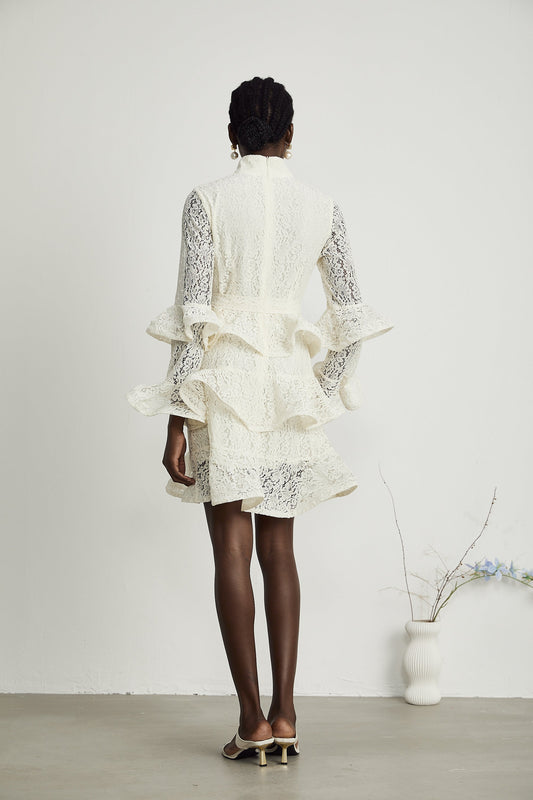 Sancia Beyaz Fırfırlı Güpür Dantelli Boyundan Bağlamalı Elbise