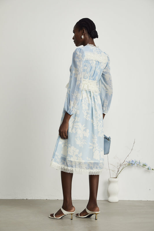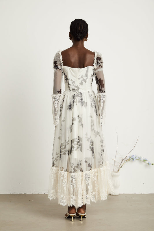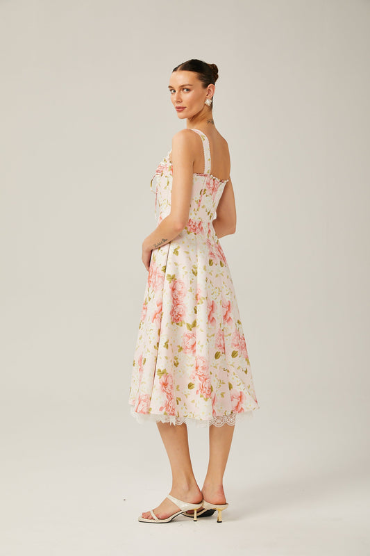 22% İndirimMargaux Çiçek Desenli Dantel Detaylı Midi Elbise