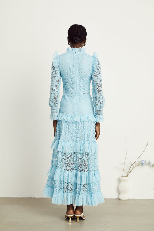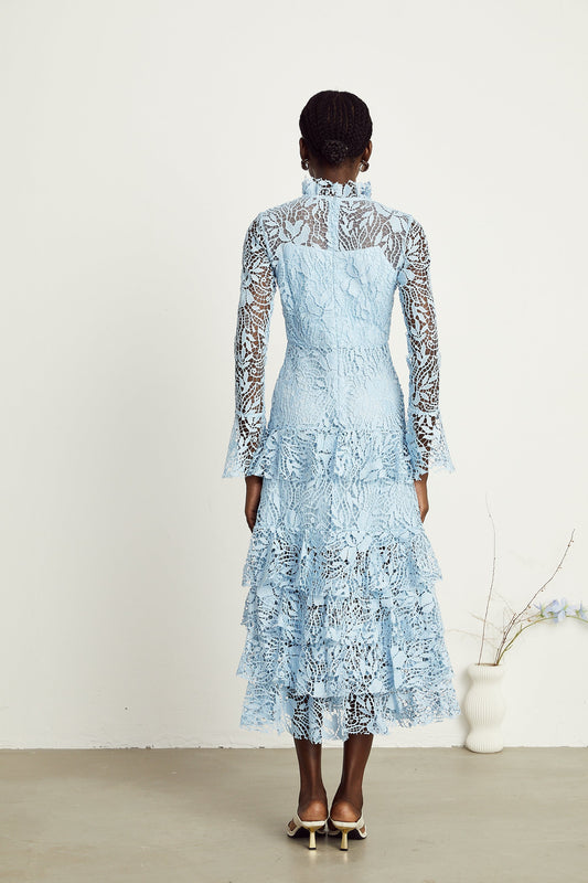 Pascale Mavi Güpür Dantelli Fırfırlı Katmanlı Midi Elbise