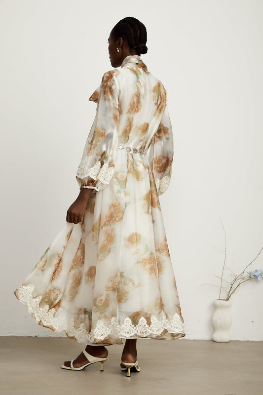 Ondine Suni İnci Çiçek Desenli Dantel Midi Elbise