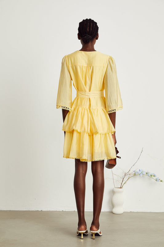 20% İndirimKarine Sarı Dantel Detaylı Katlı Mini Elbise