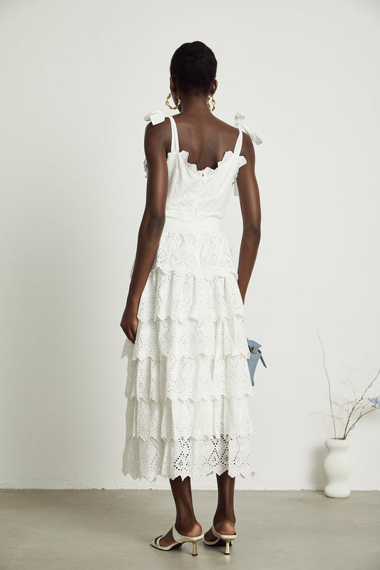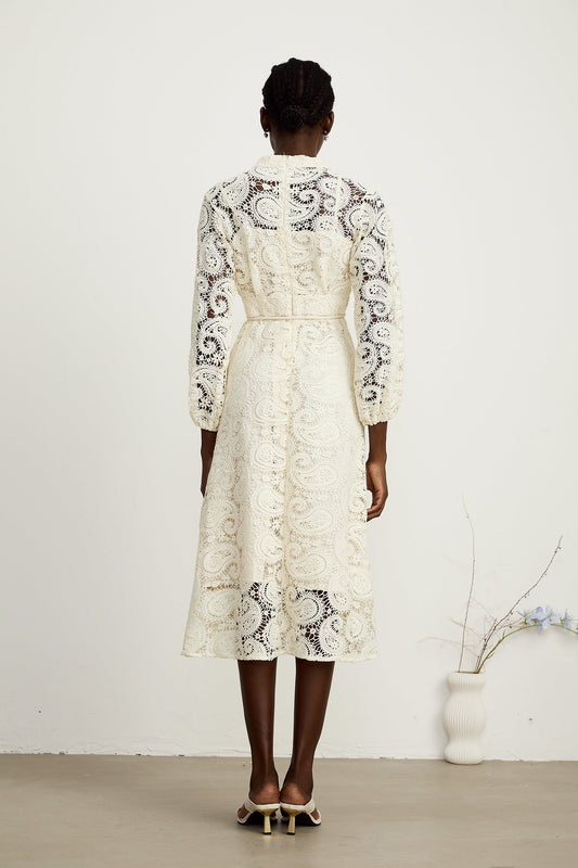 Colette Beyaz Dantel Detaylı Bağcıklı Bel Midi Elbise