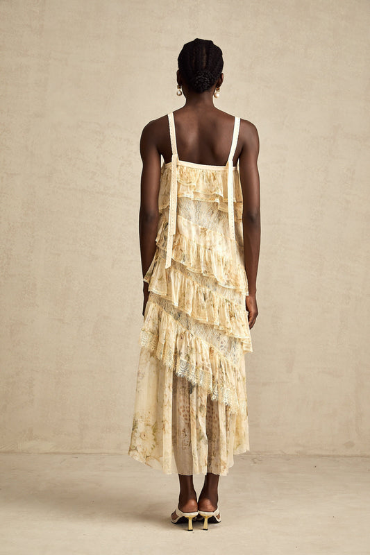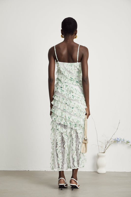 Céleste Fırfırlı Dantelli Çiçek Desenli Midi Elbise