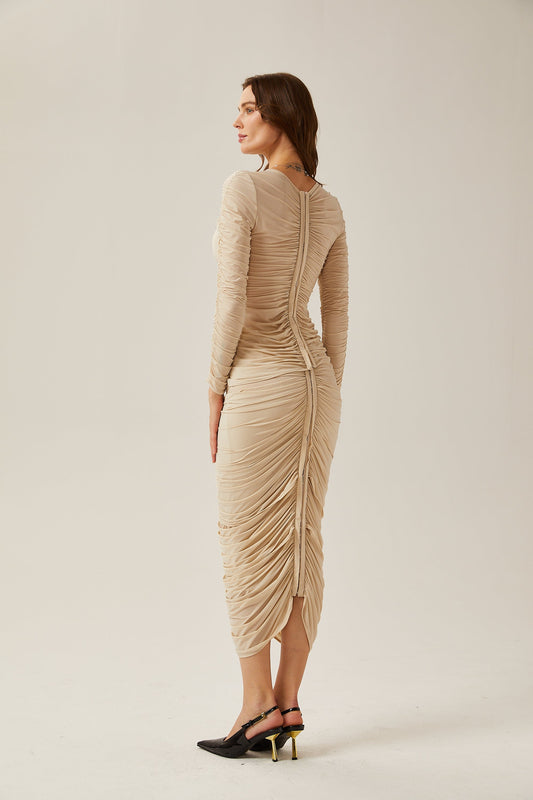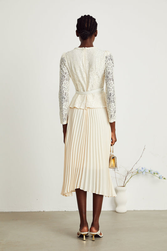 Filipinli Dantel Katlanmış Yüksek Belli Midi Elbise