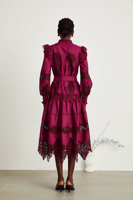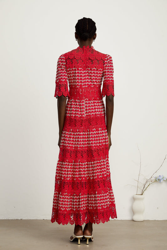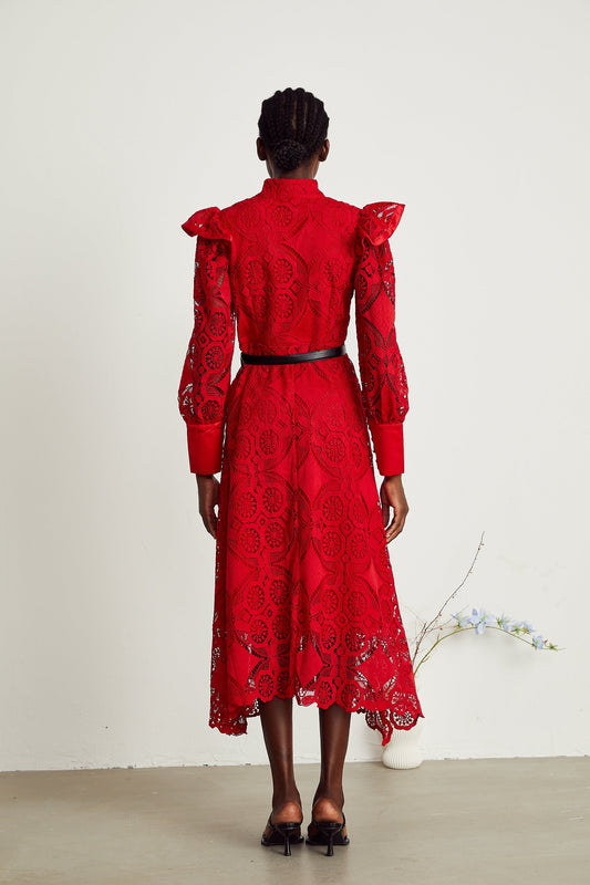 19% İndirimJosiane Kırmızı Güpür Dantelli Midi Elbise