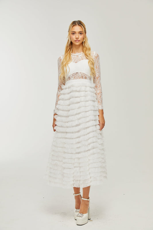 27% İndirimClarabelle Gipür Dantelli Fırfırlı Midi Elbise