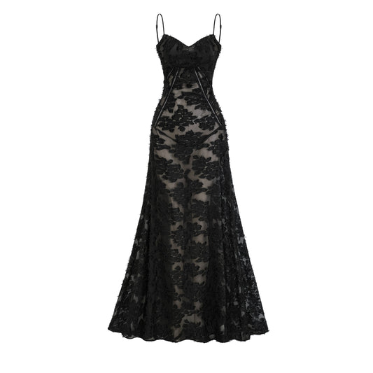 14% İndirimEmmy Çiçek İşlemeli Dantel Fırfırlı Maksi Elbise