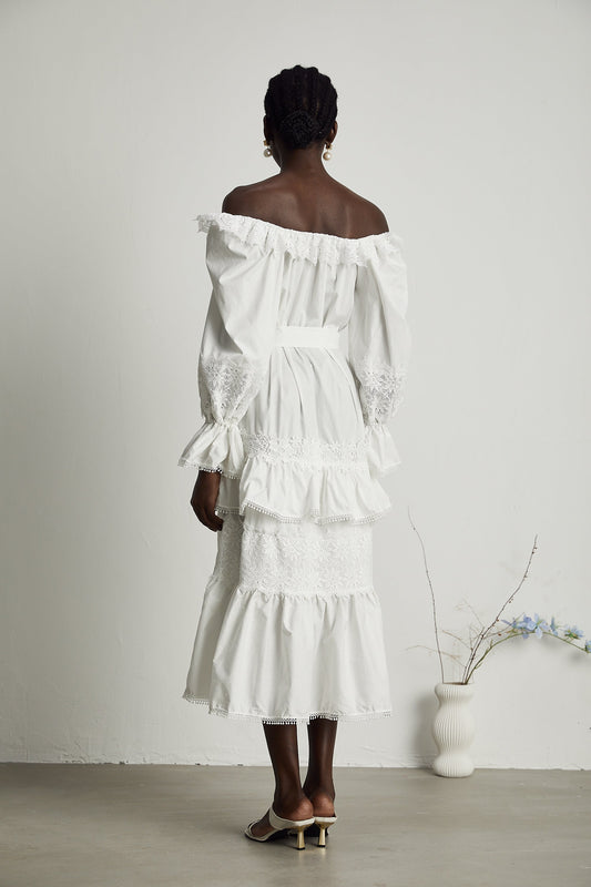24% İndirimAlora Beyaz Dantel Şeritli Katlı Midi Elbise