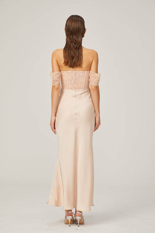 25% İndirimAmélie Dantelli Deri Düşük Omuzlu Midi Elbise