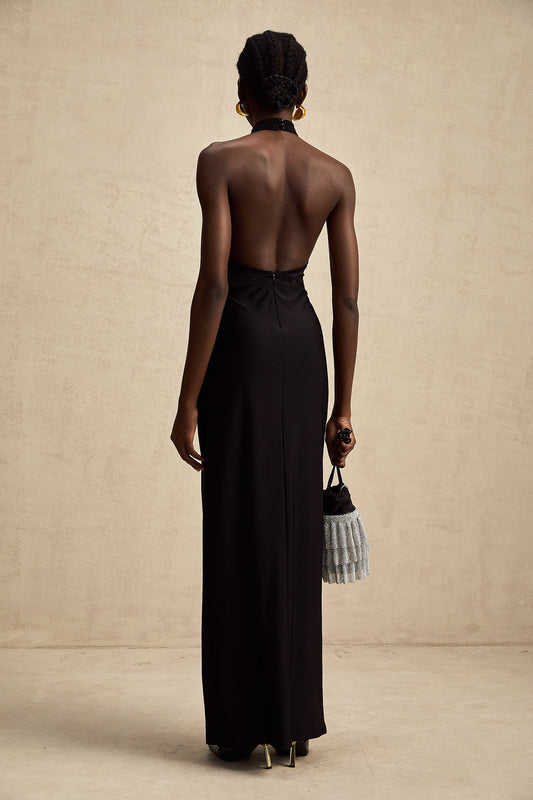 Camille siyah yarım yaka çiçekli dantelli maksi elbise