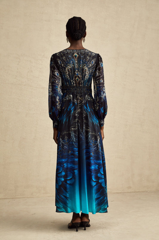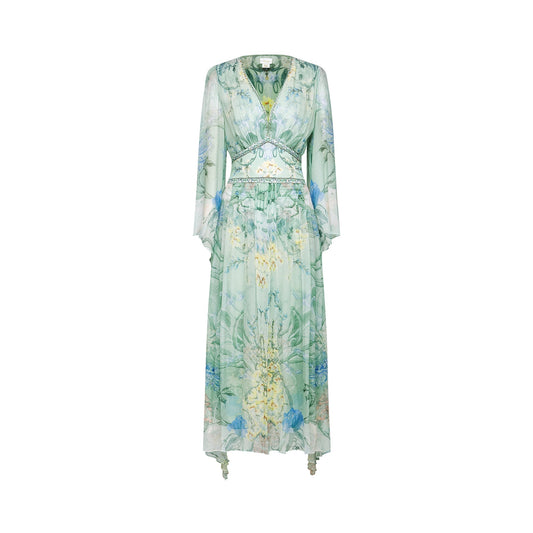 Emmelina İpek Kristal Süslü Çiçek Desenli Midi Elbise