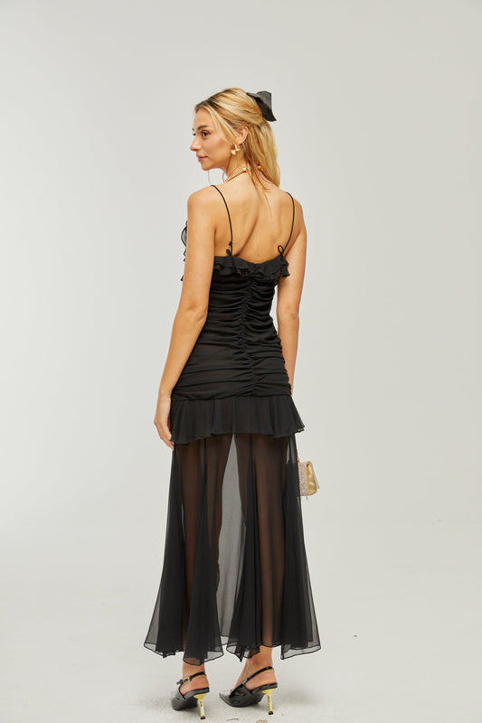 Jacqueline Suni Siyah İpek Fırfırlı Pileli Tül Maksi Etek