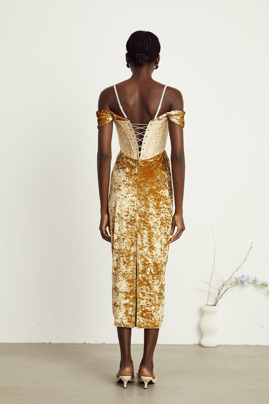 Katherine Siyah & Beyaz Omuzları Açık Korse Midi Elbise