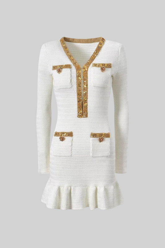 Uzun Kollu ve Altın Detaylara Sahip Dokulu Mini Elbise