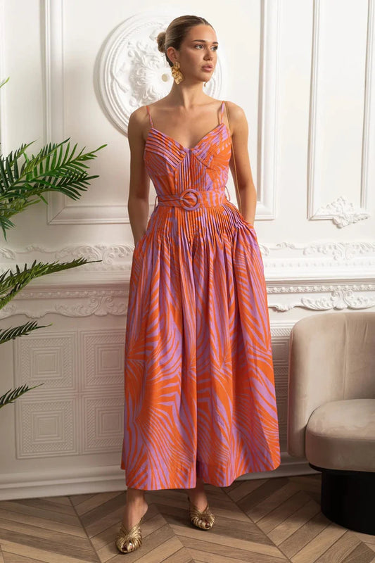 Pileli Göğüslü, Kemerli ve İnce Askılı Midi Elbise - Mor