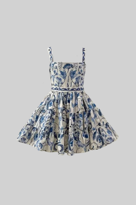 Mavi Çiçek ve Paisley Desenli Dar Mini Elbise - Beyaz