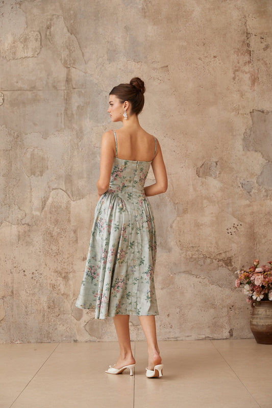Prunelle adaçayı yeşili çiçek desenli büzgülü midi elbise