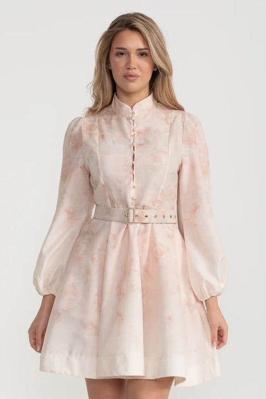 Suluboya Çiçekli Kemerli Mini Elbise Mandarin Yakalı