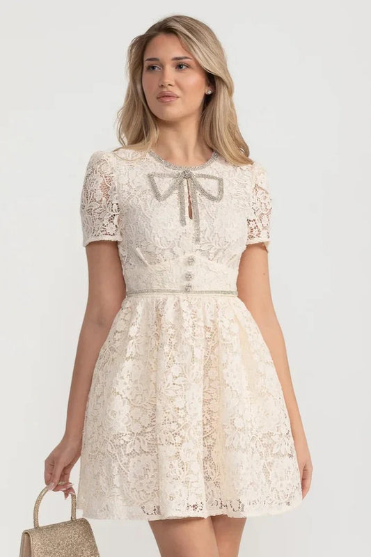 Yuvarlak Yakalı ve Dekoratif Fiyonklu Kısa Kollu Dantel Elbise - Fildişi