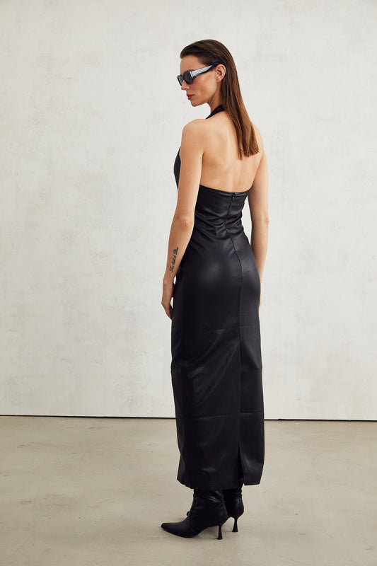 Lucienne Siyah Deri Boyundan Bağlamalı Midi Elbise