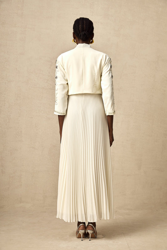Blanche Beyaz İşlemeli Pileli Ceket Ve Elbise Uyumlu Takım Elbise