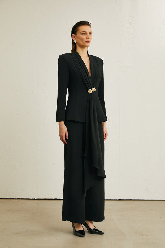 Aurela Siyah İşlemeli Ceket & Pantolon Uyumlu Takım