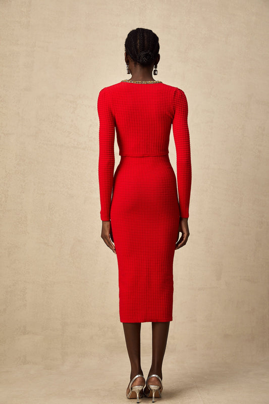 Axelle Kırmızı İşlemeli Örgü Hırka & Etek Kombin Takım