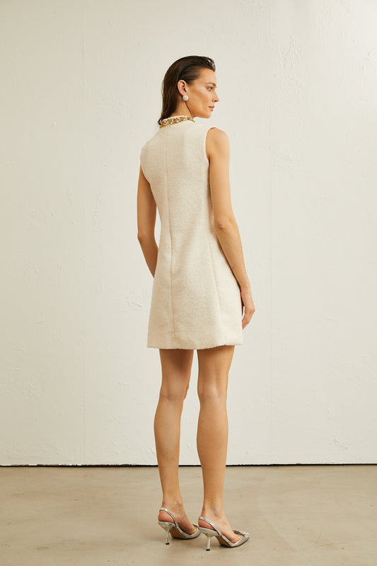 20% İndirimPauline Beyaz Tüvit Boncuk İşlemeli Mini Elbise