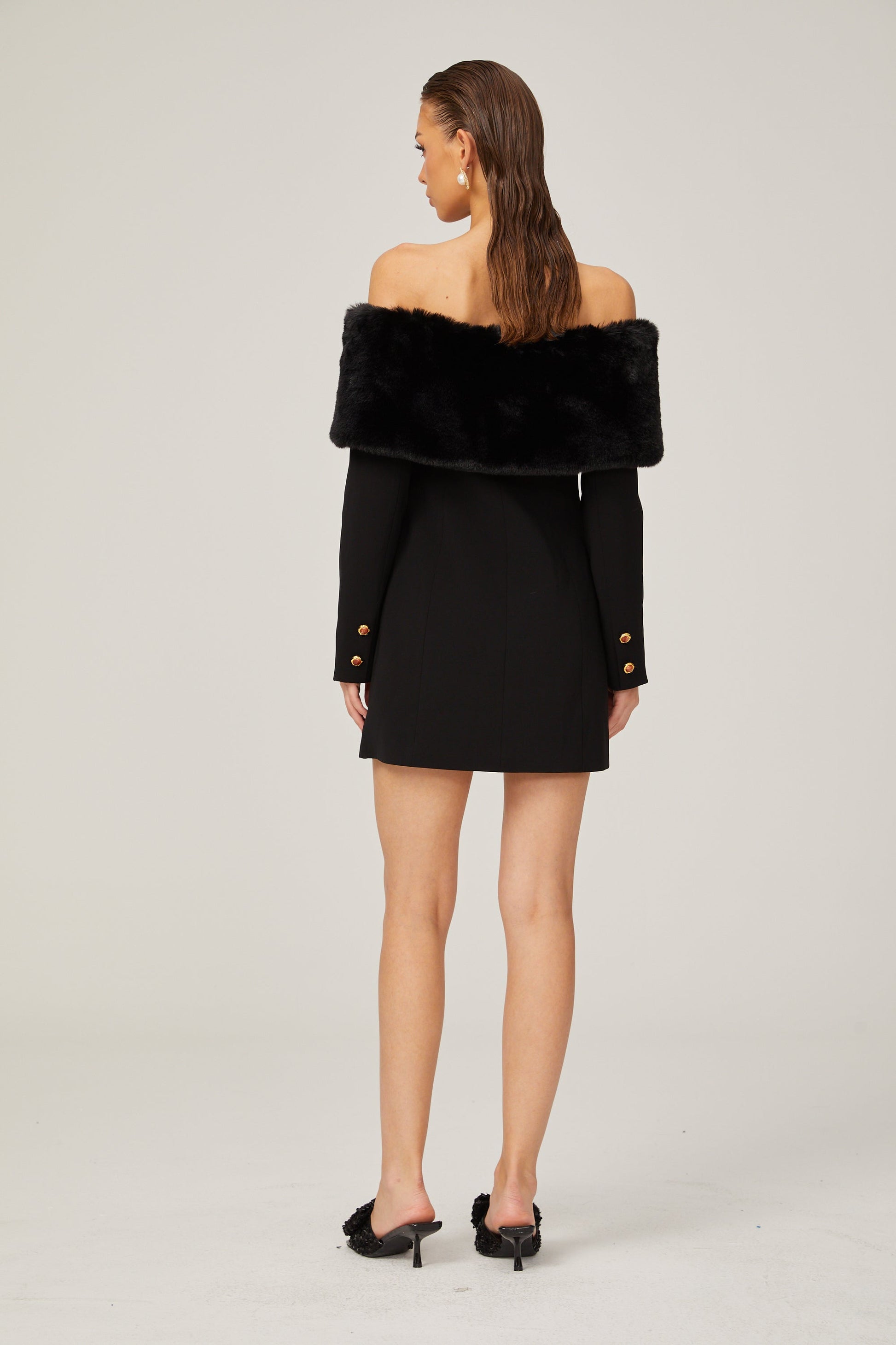 Céline Siyah Suni Kürk Omuzları Açık Mini Elbise
