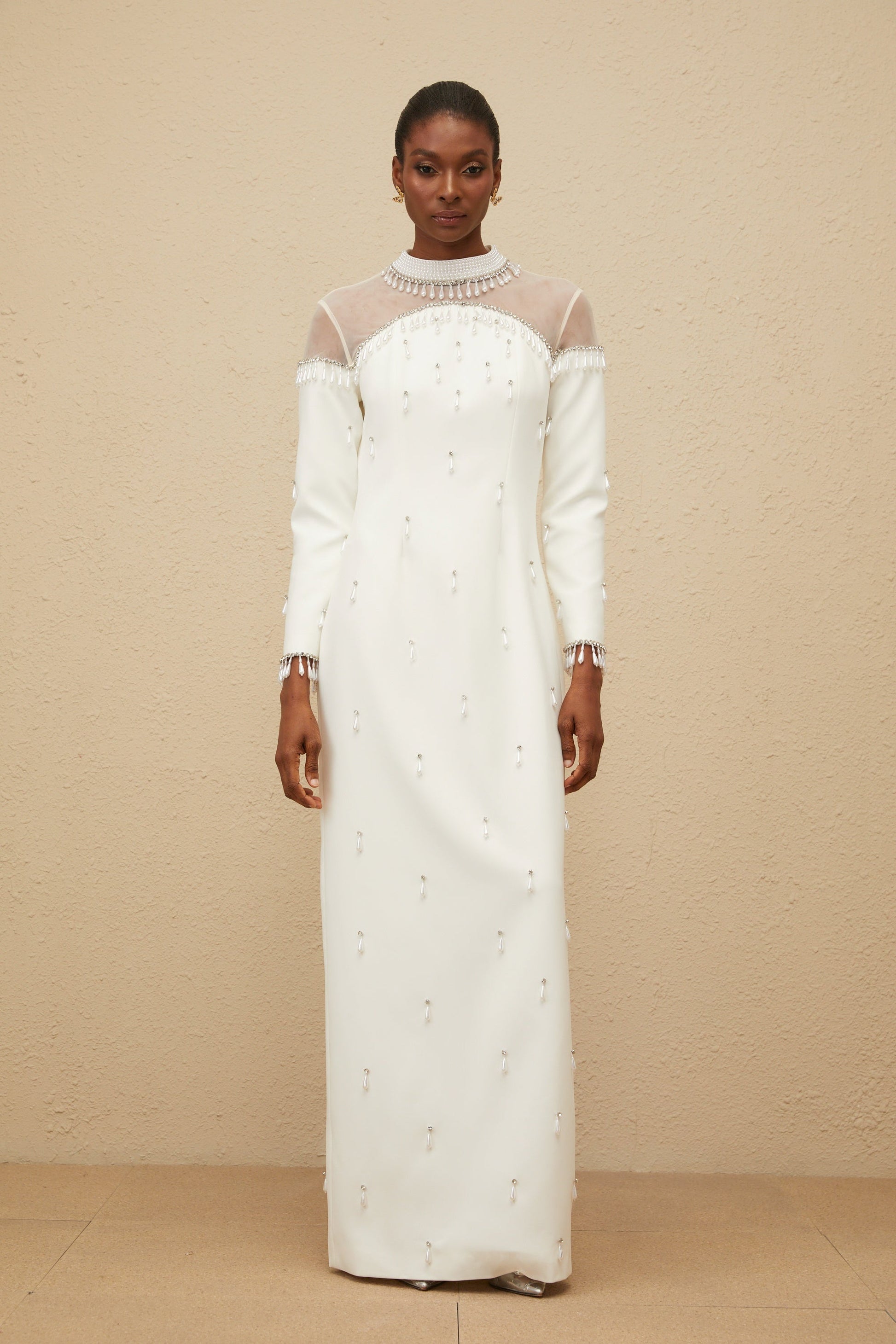 Céline Beyaz Süslemeli Uzun Abiye Elbise