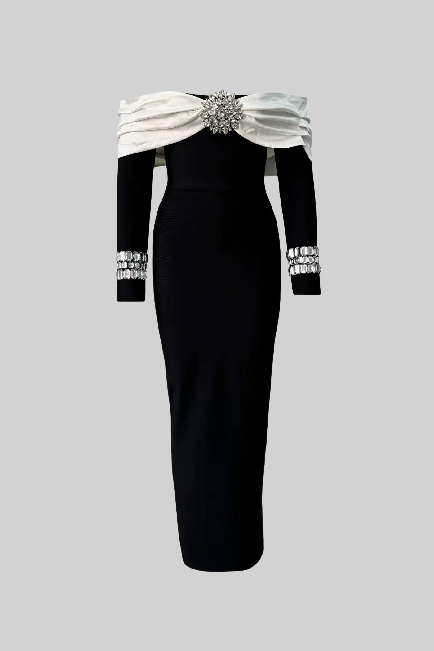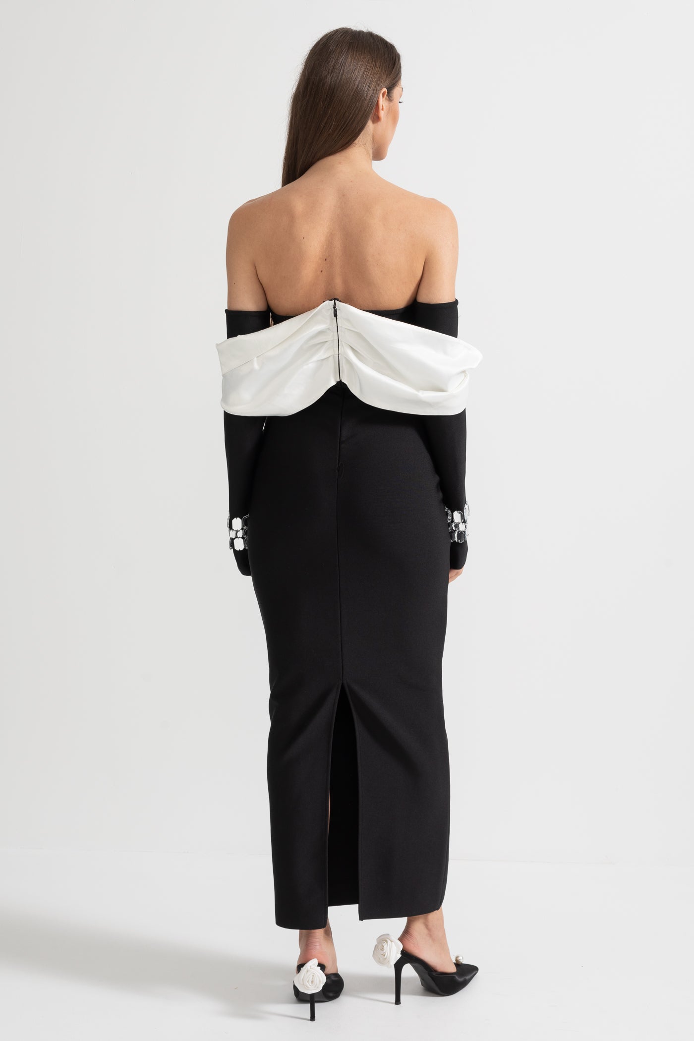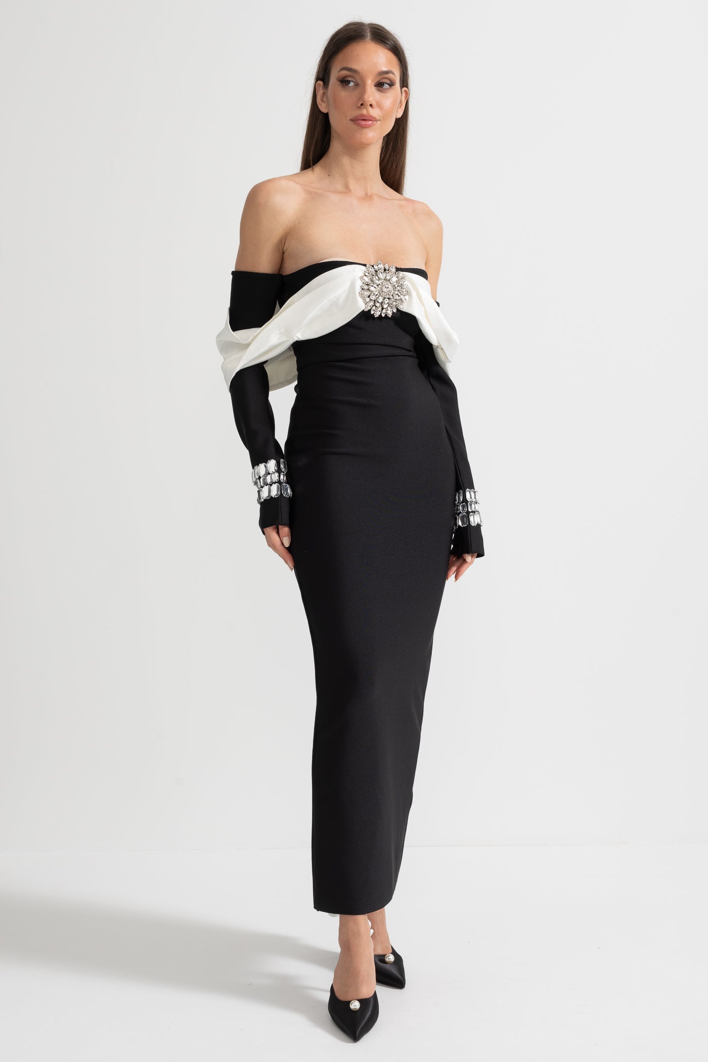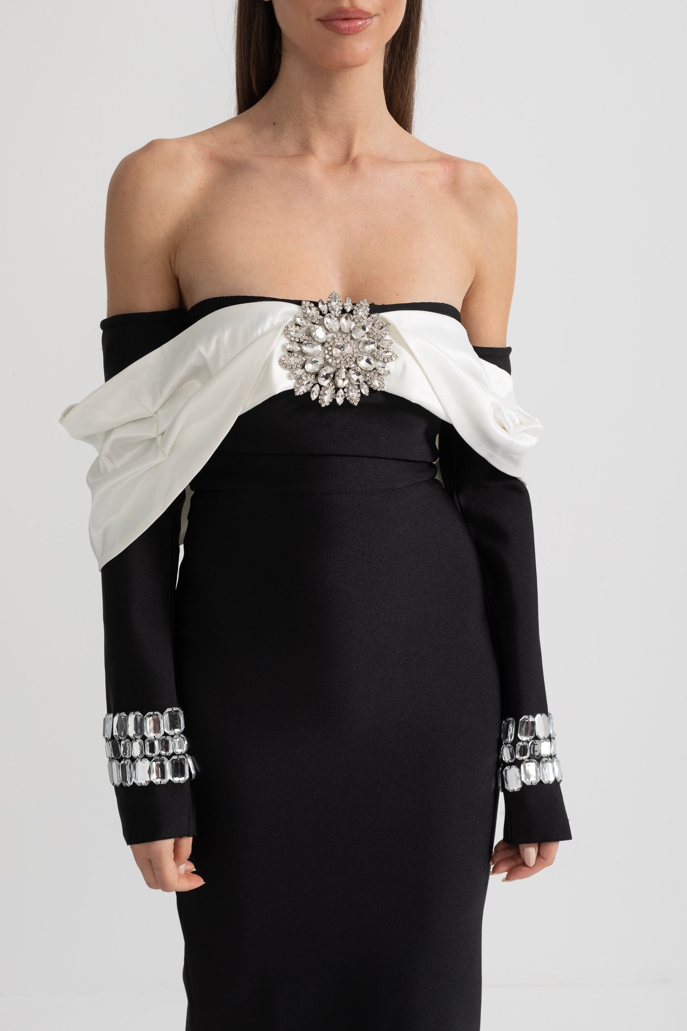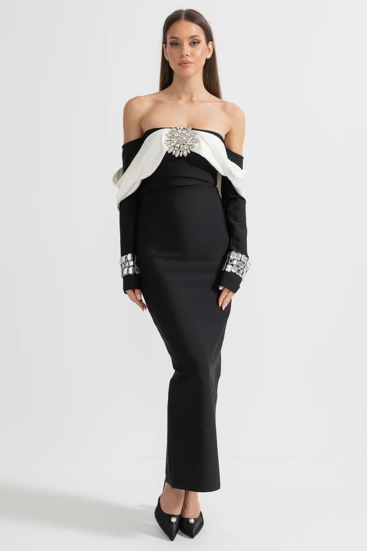 Kontrast Büstiyer ve Parıltılı Süslemelerle Şık Omuz Açık Elbis