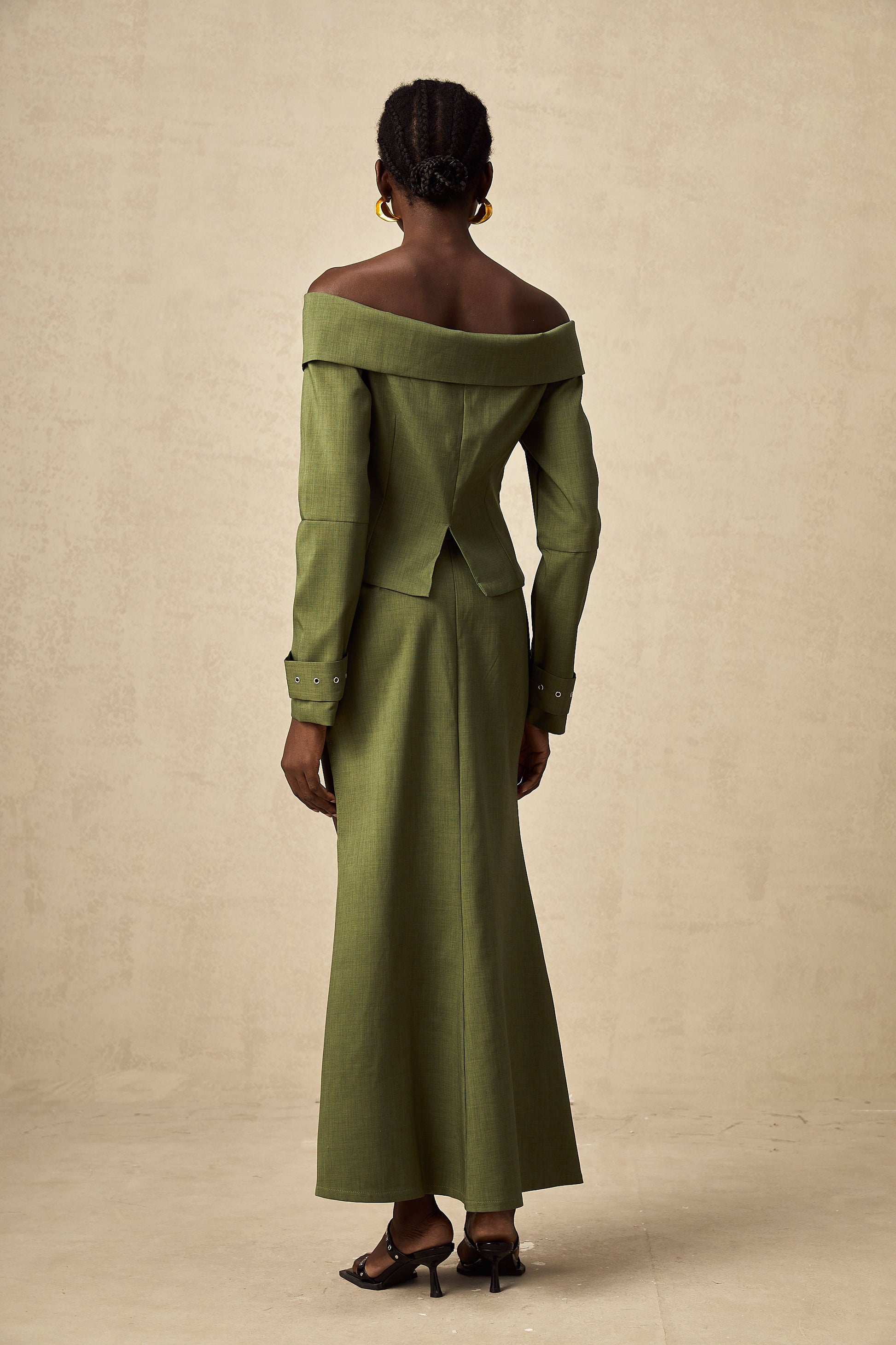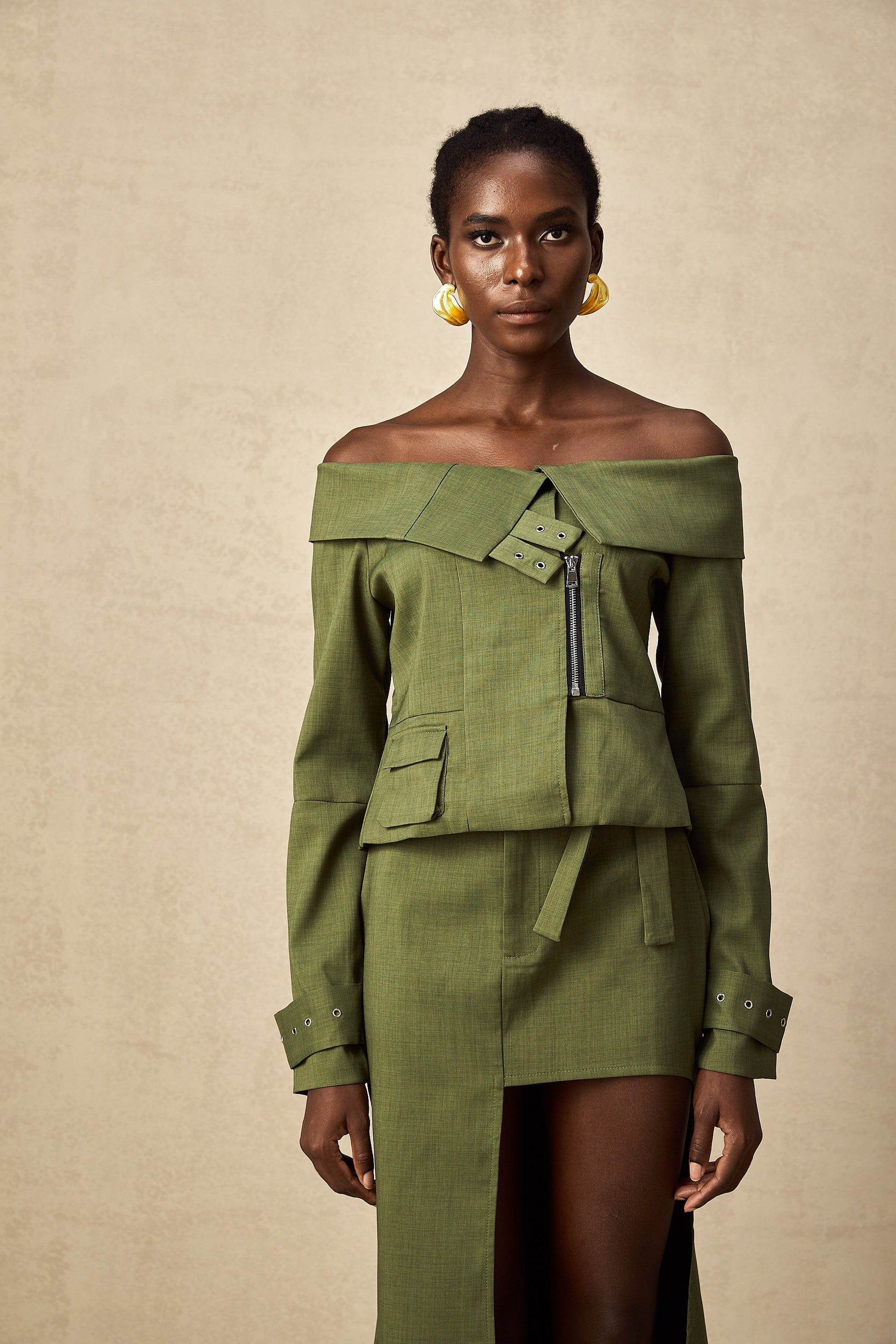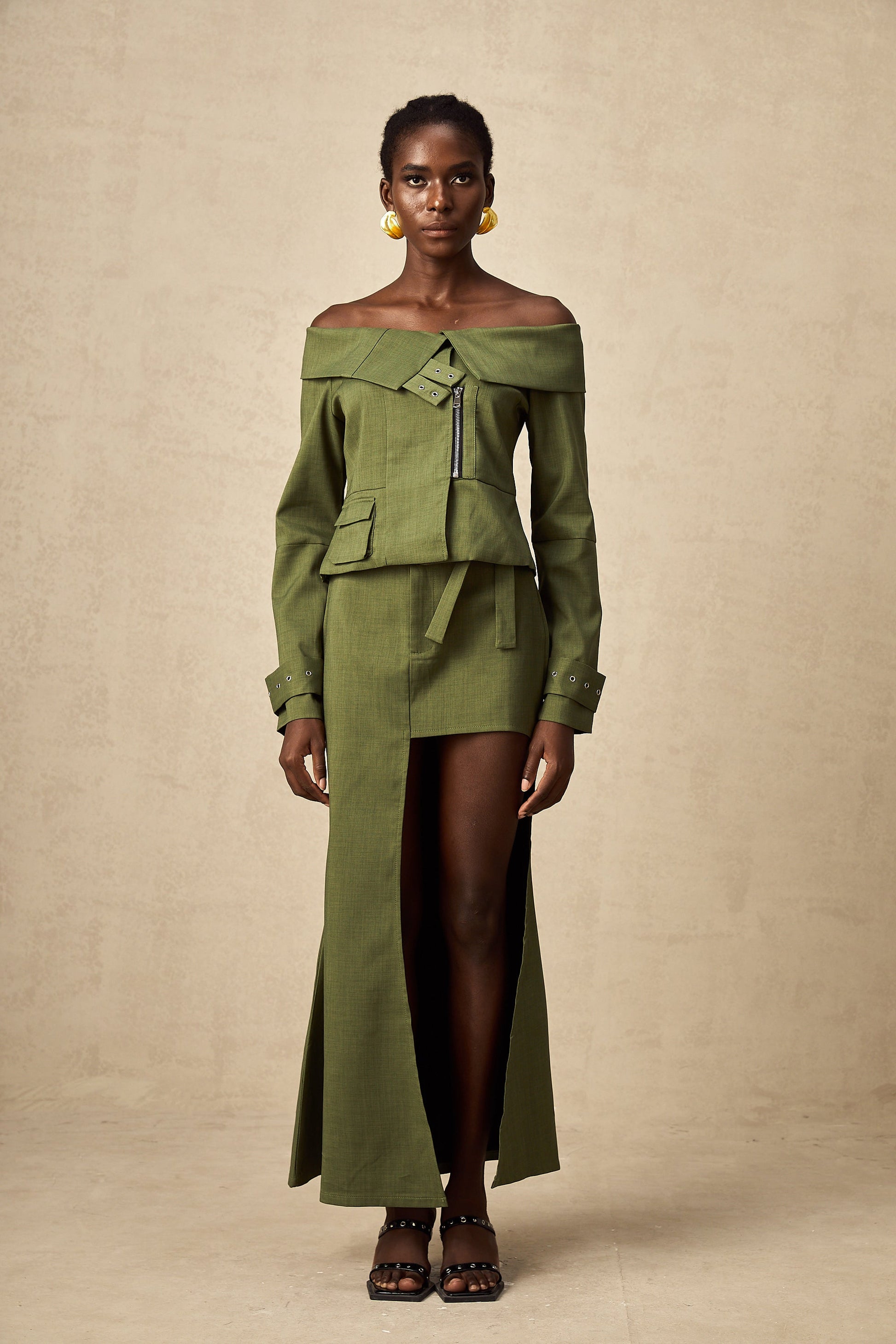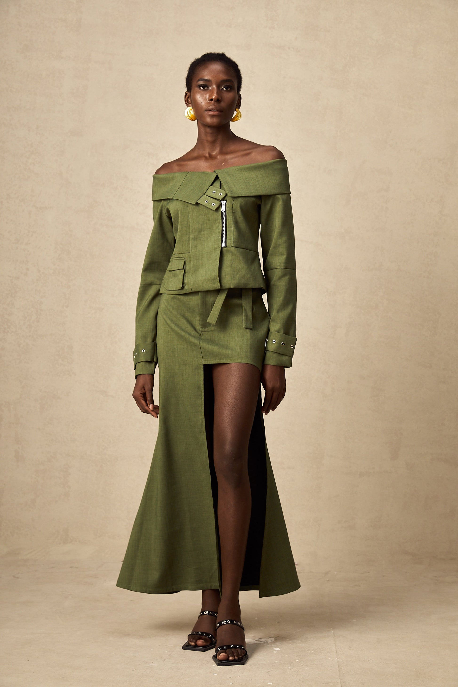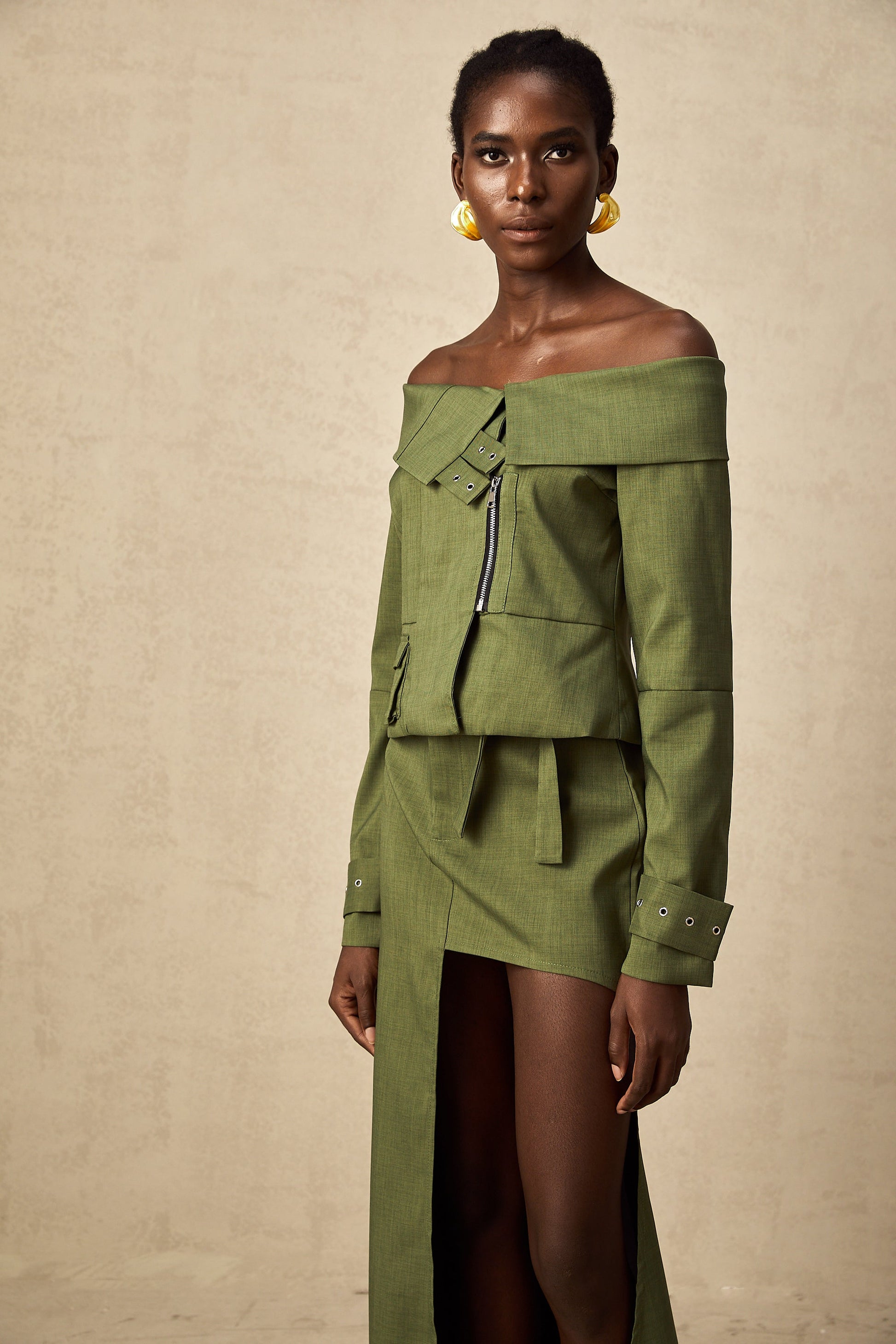 Éléna Yeşil Asimetrik Tasarımlı Ceket & Etek Eşleştirme Seti