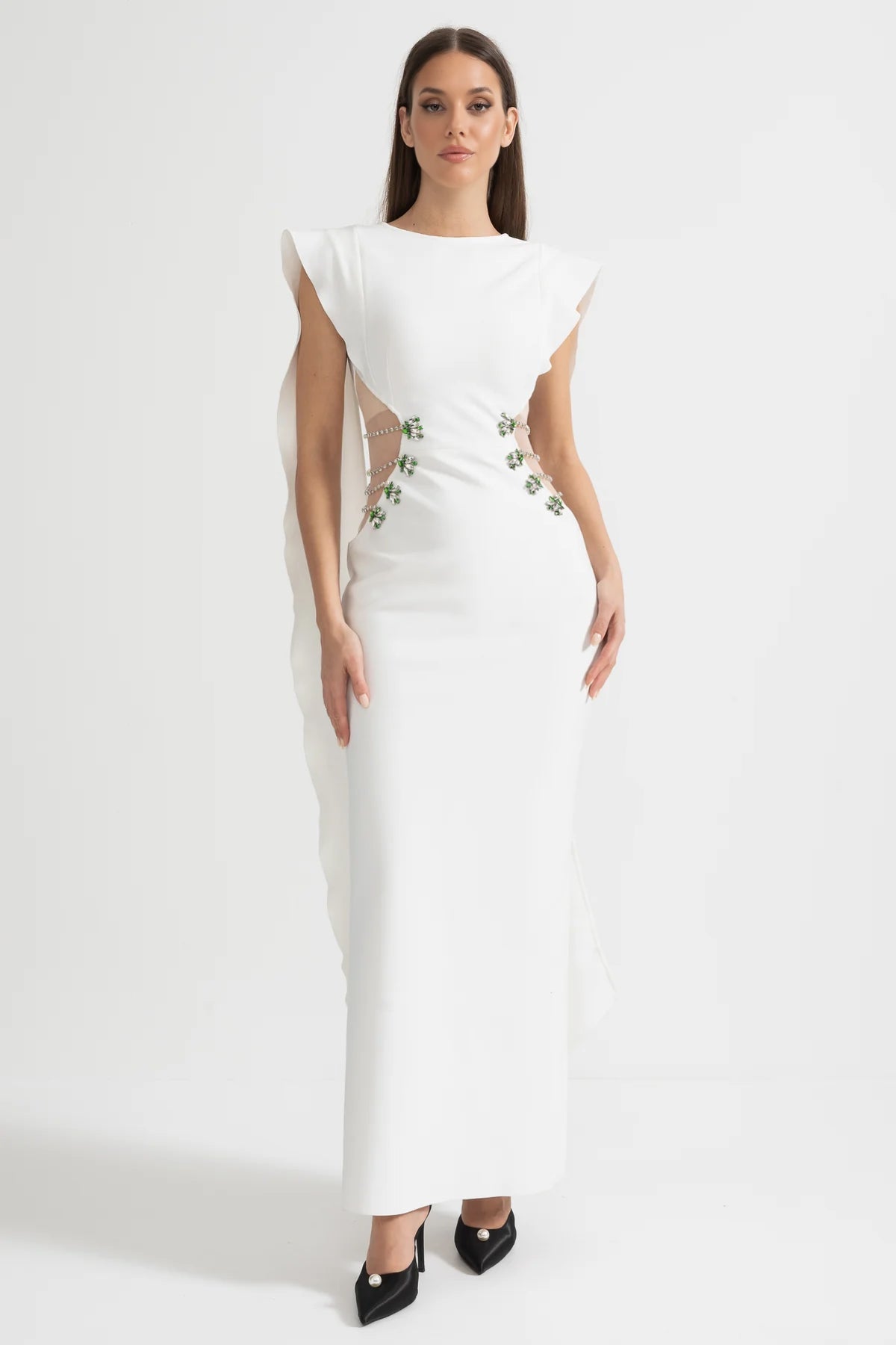 Luna Gösterişli Yan Detaylara Sahip Süslemeli Kesikli Uzun Elbise