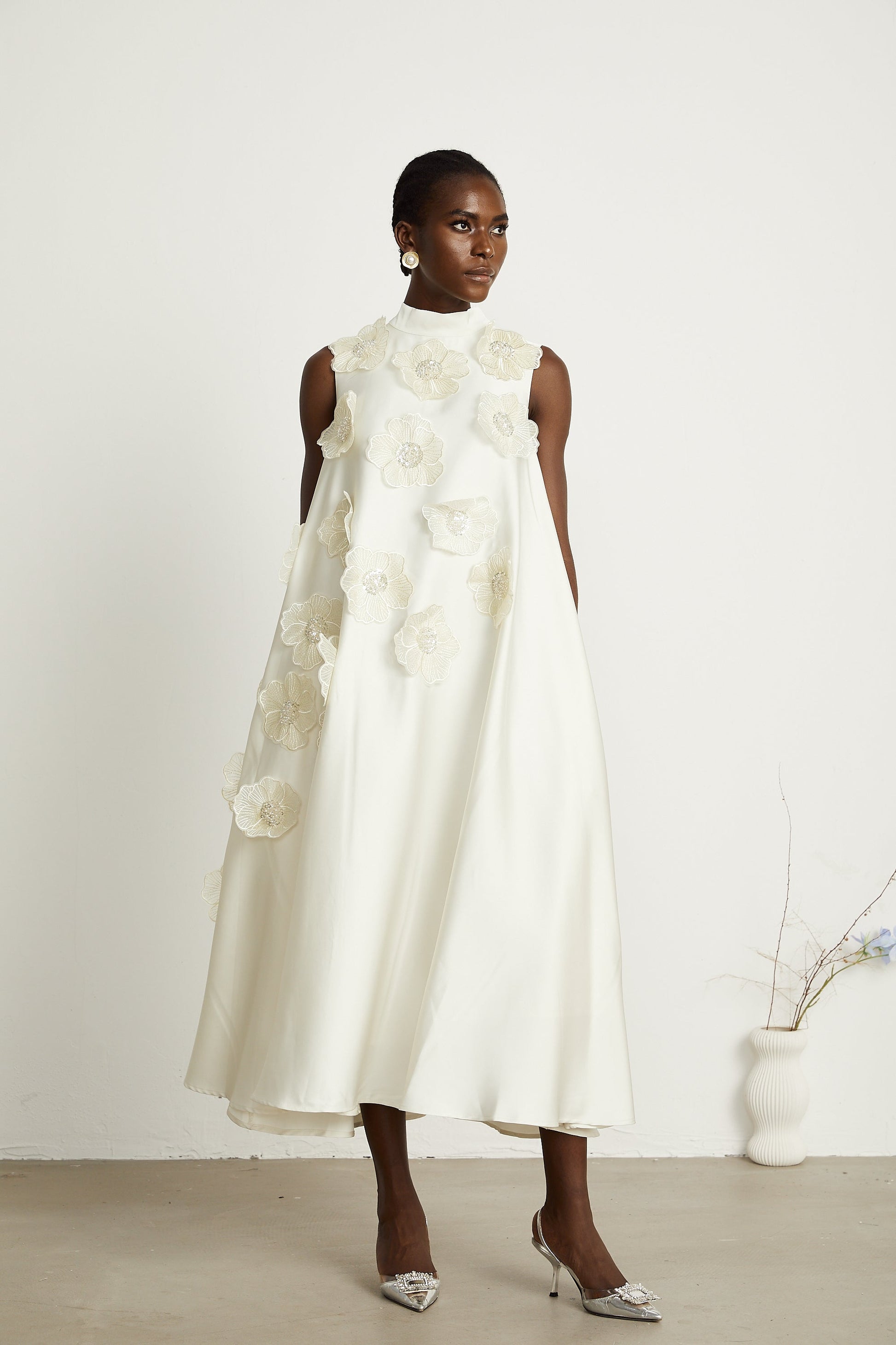 Émilie Beyaz Kolsuz Çiçek Aplikeli Maxi Elbise