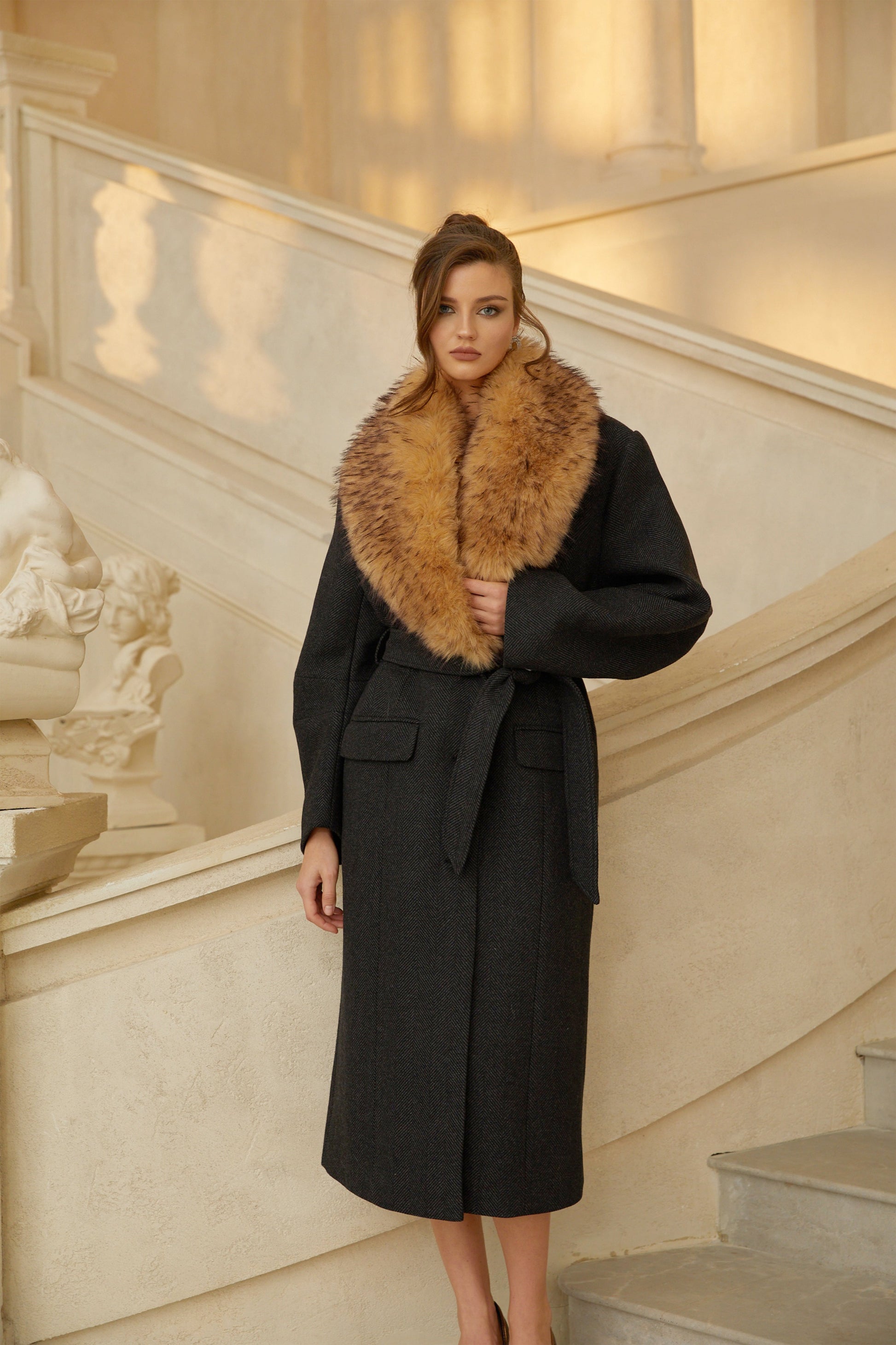 Fable Siyah Kürk Yaka Uzun Tweed Palto