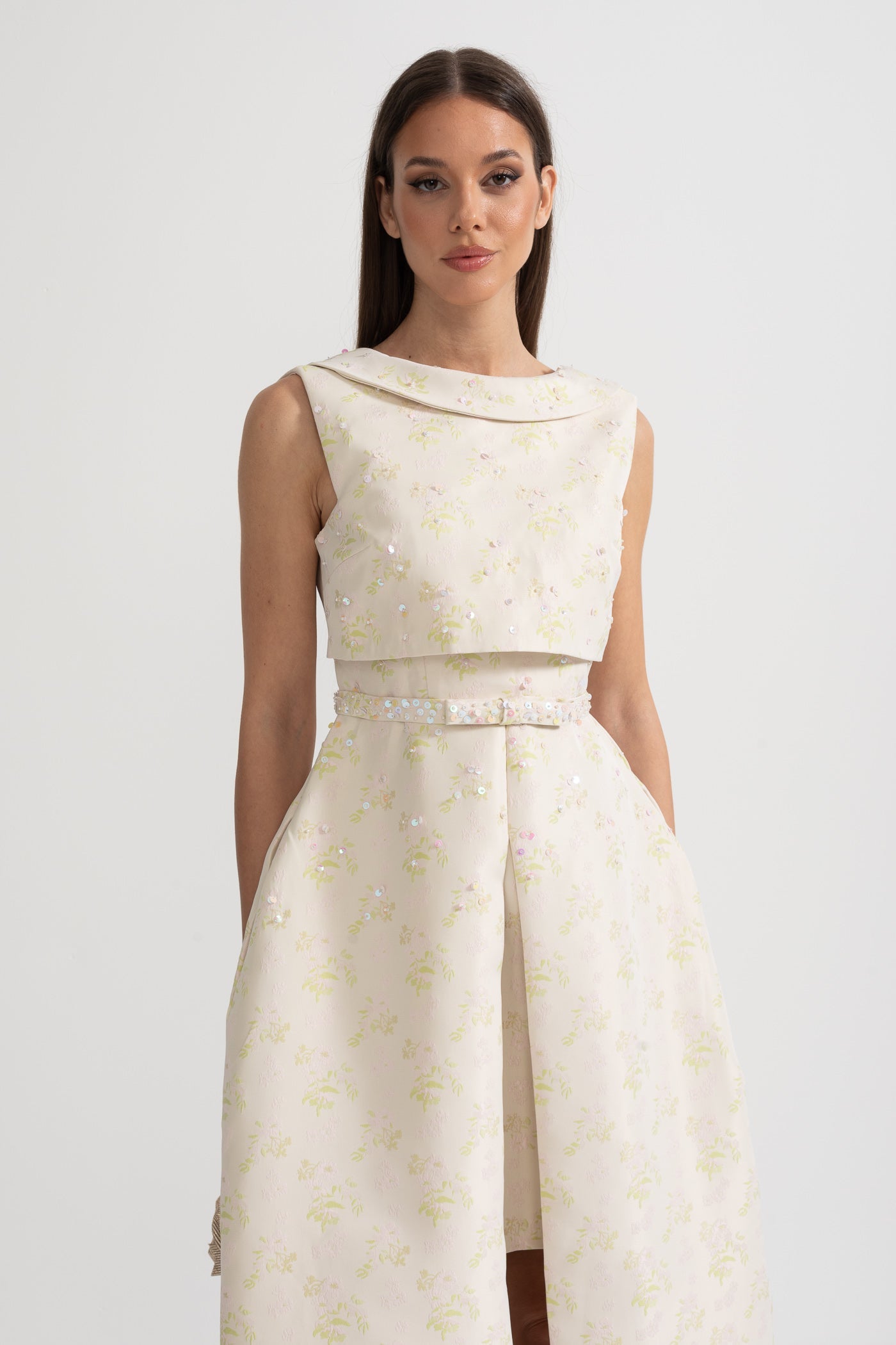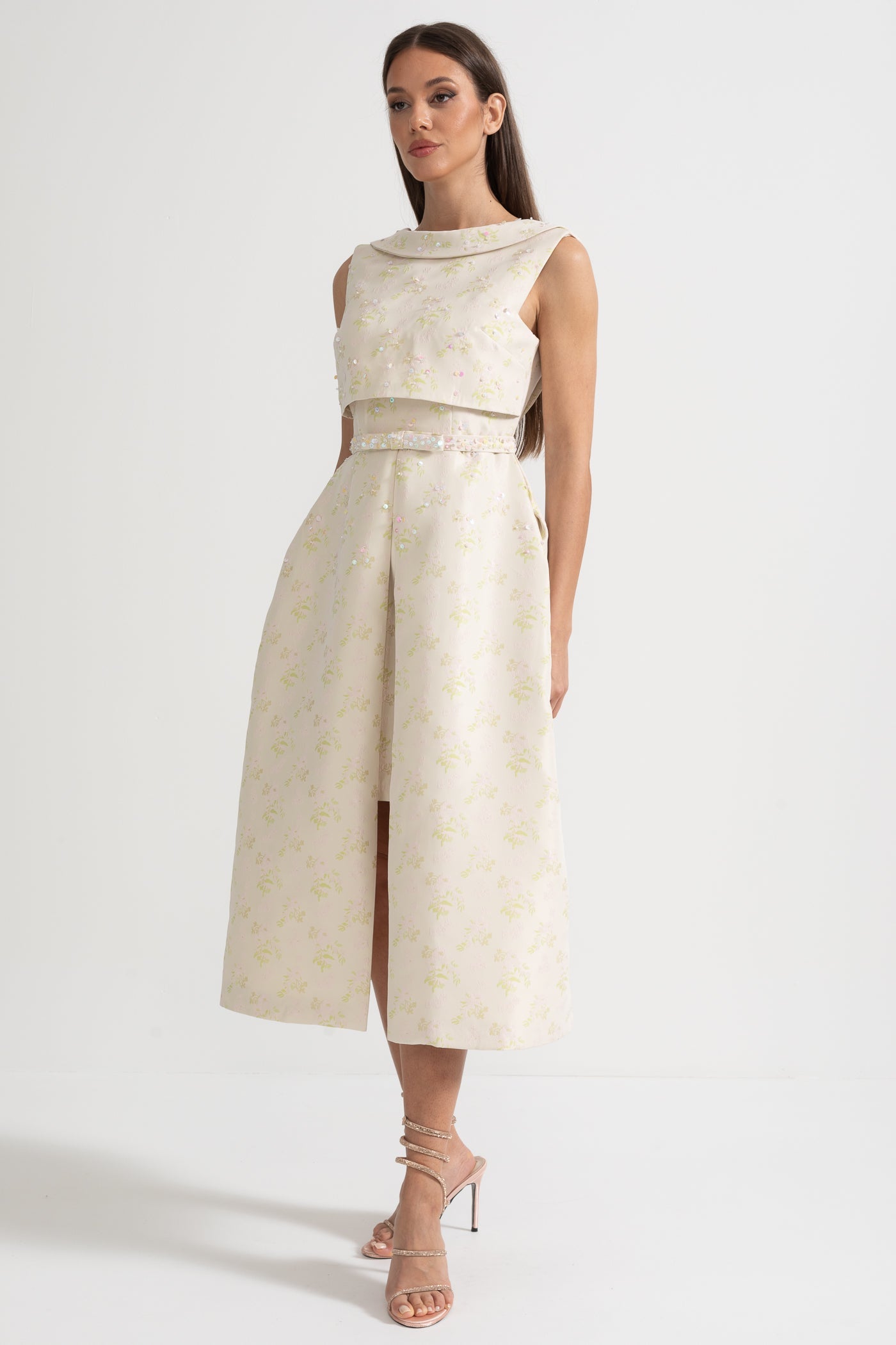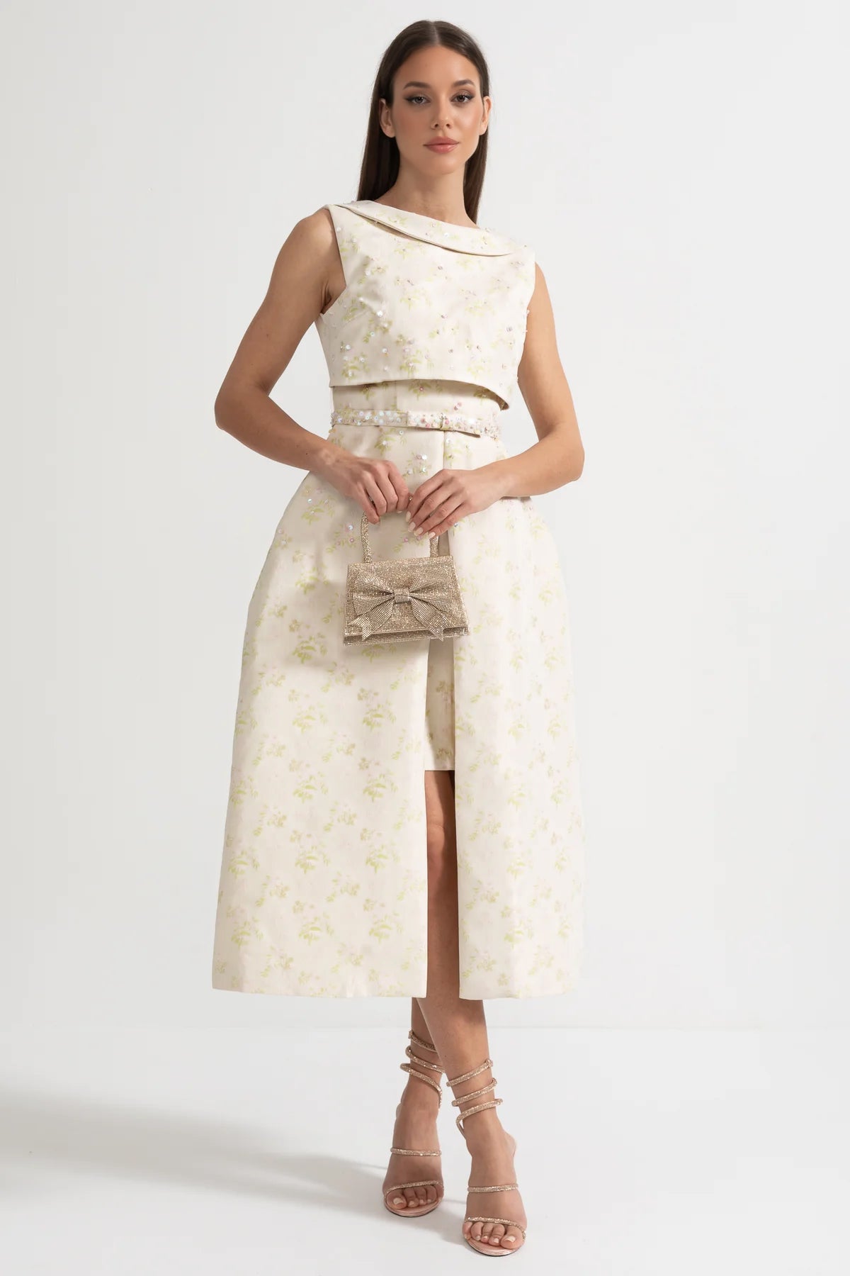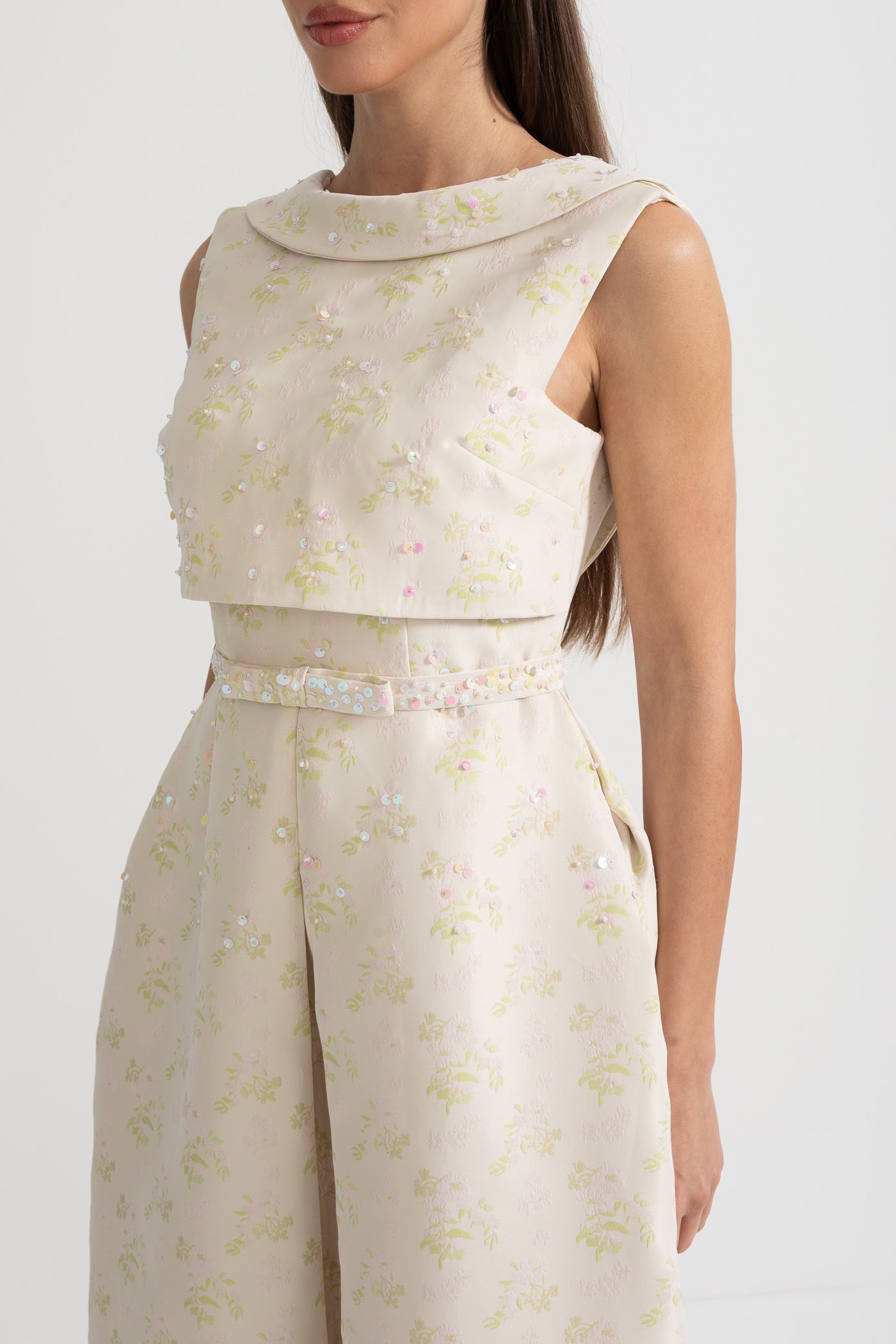Nova Yüksek Yaka ve Ön Yırtmaçlı Çiçek İşlemeli Kolsuz Elbise
