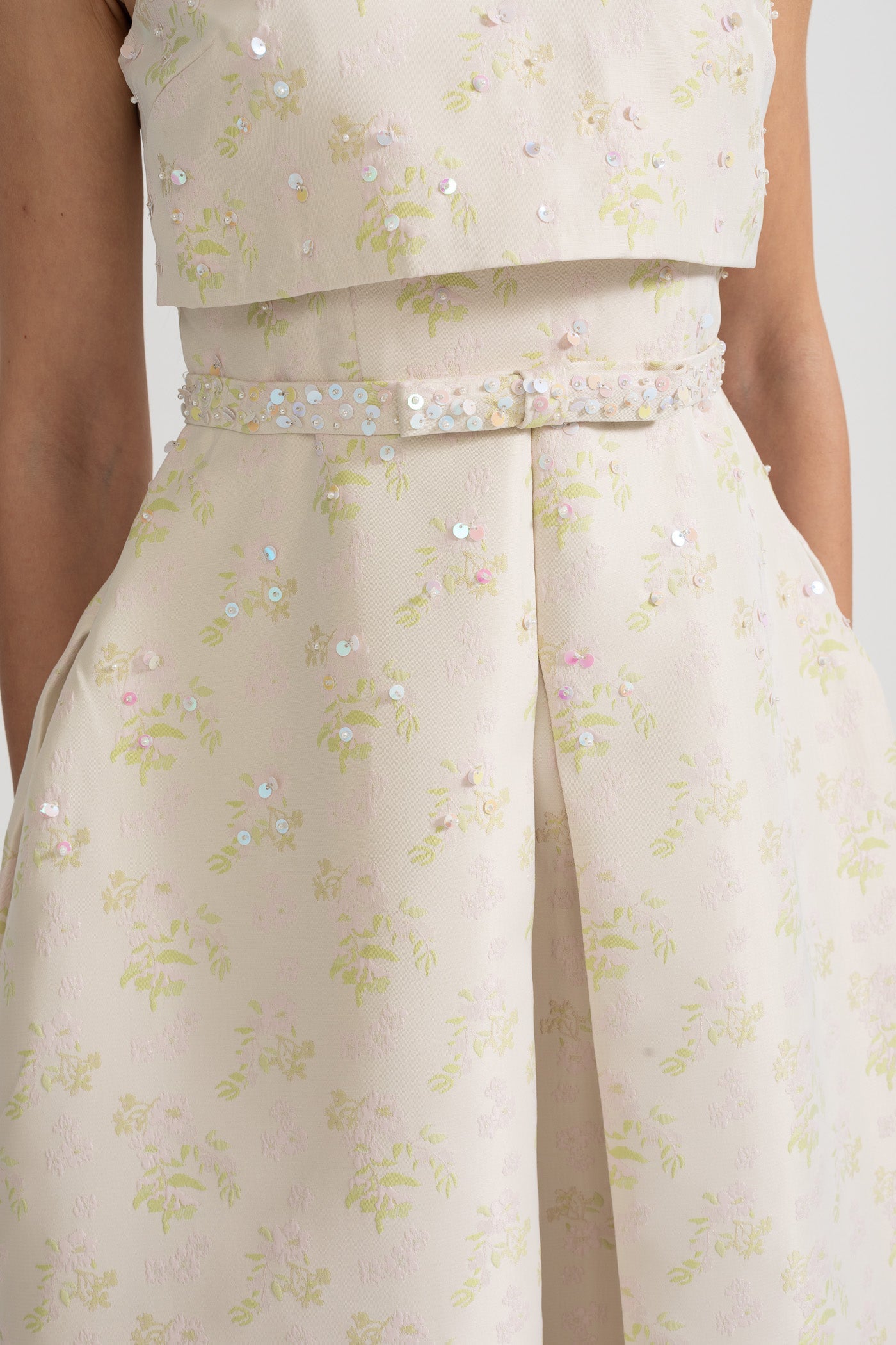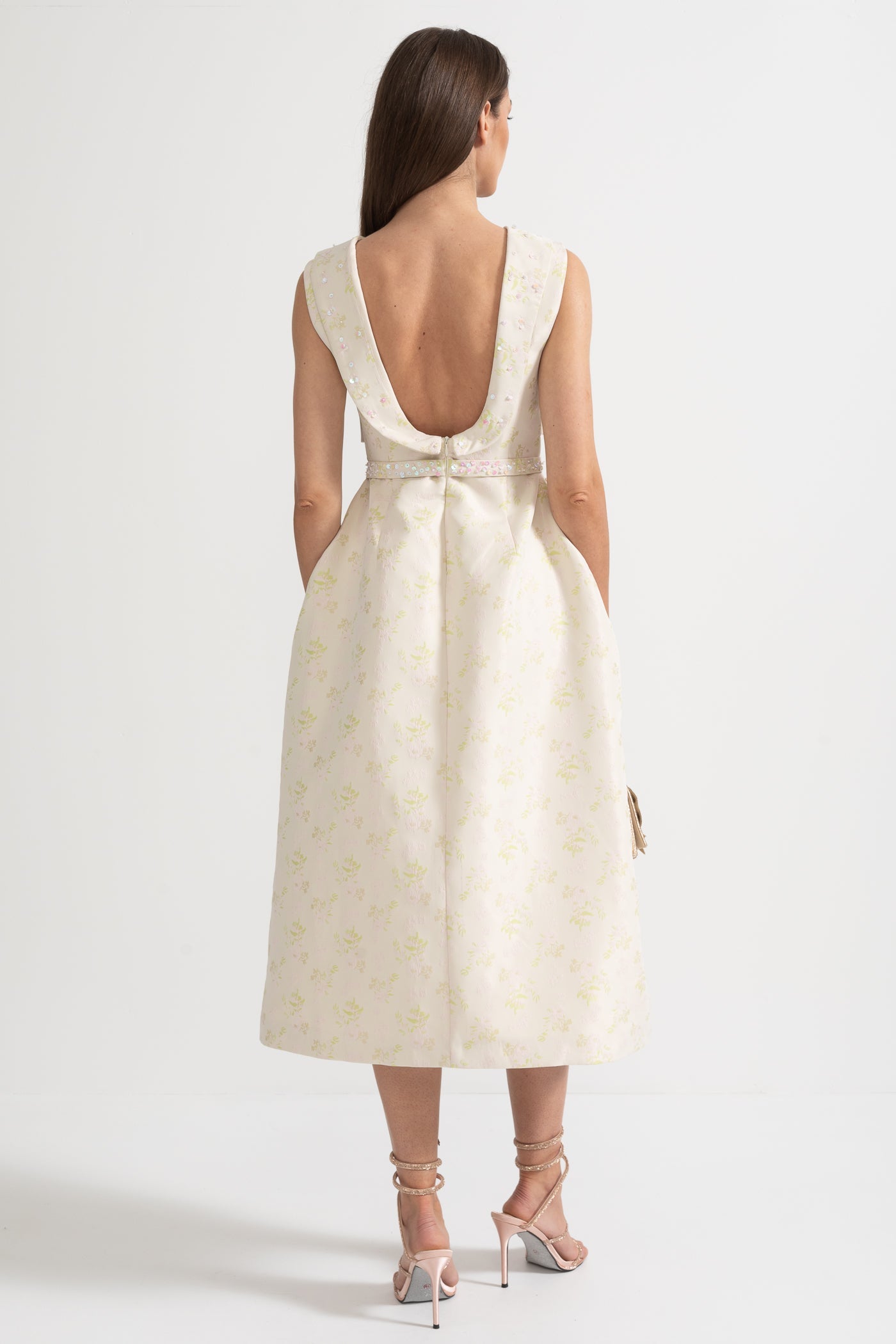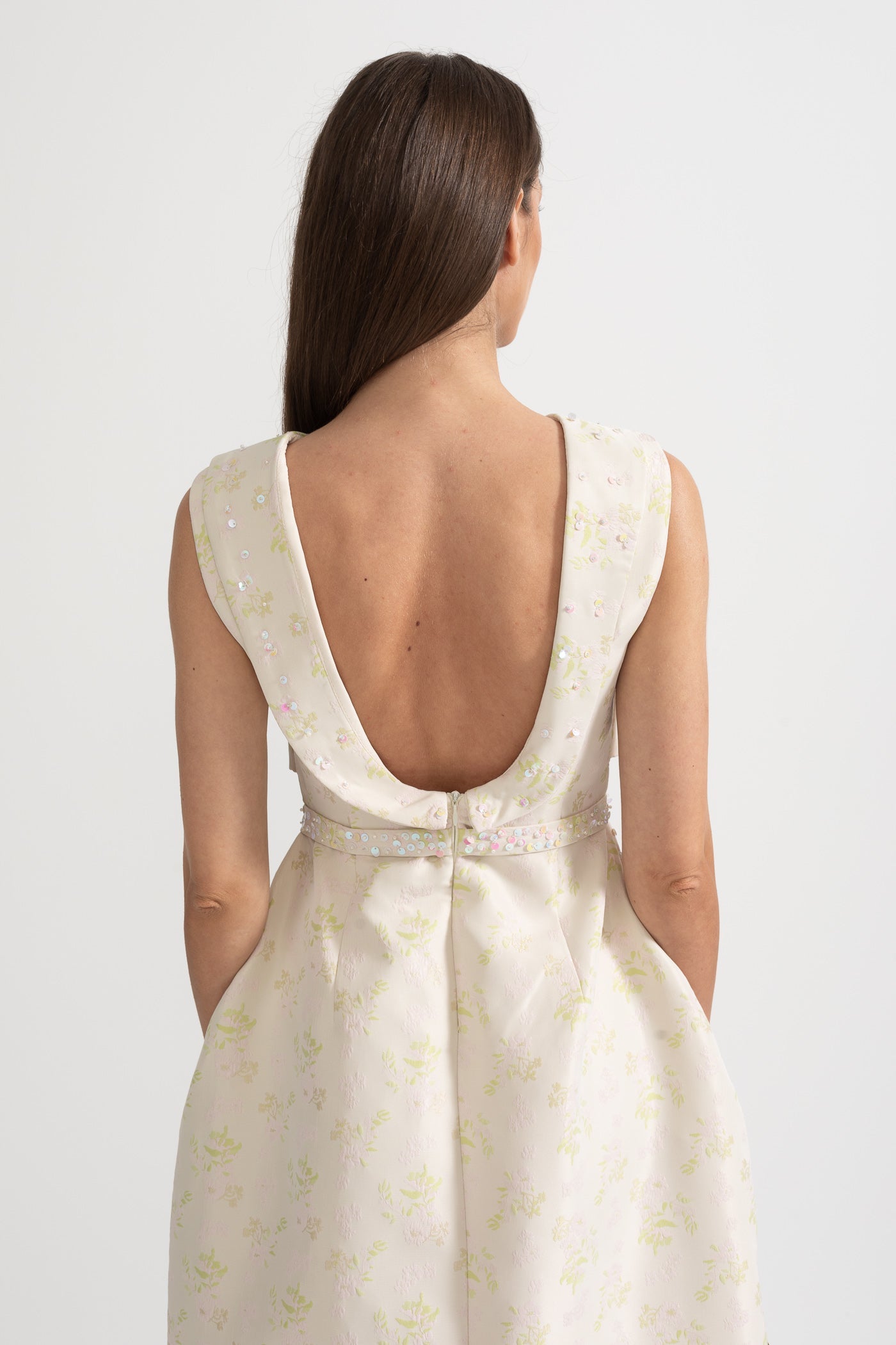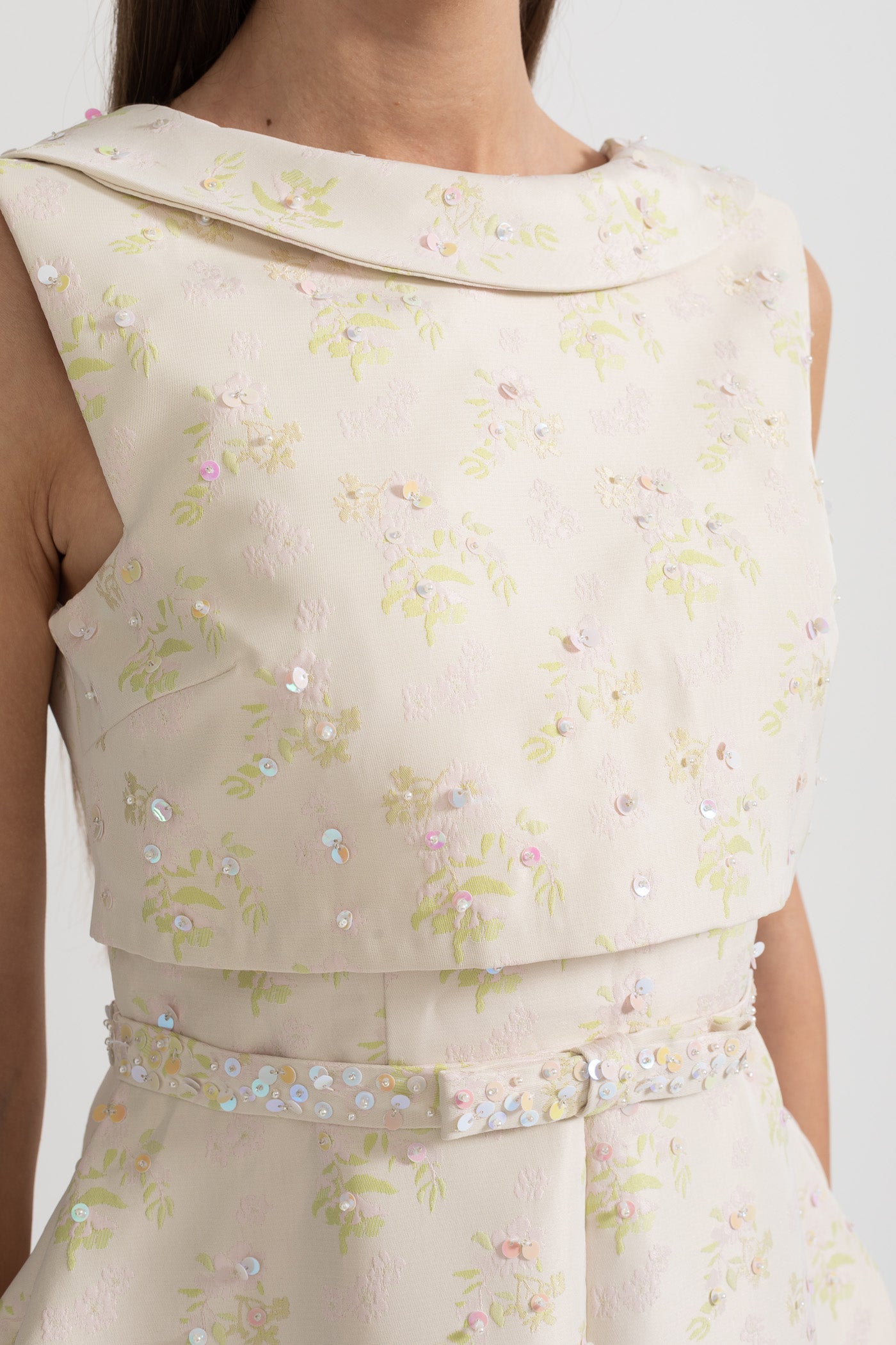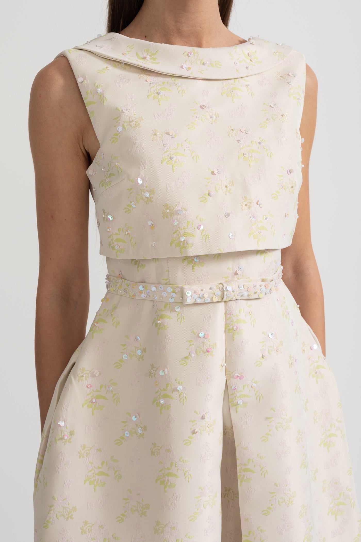 Nova Yüksek Yaka ve Ön Yırtmaçlı Çiçek İşlemeli Kolsuz Elbise