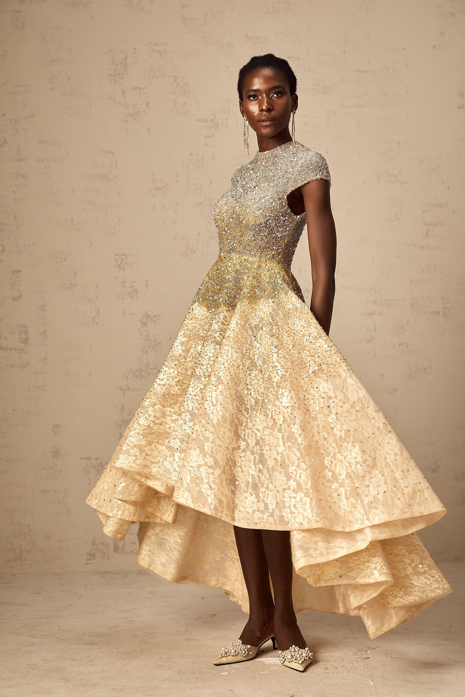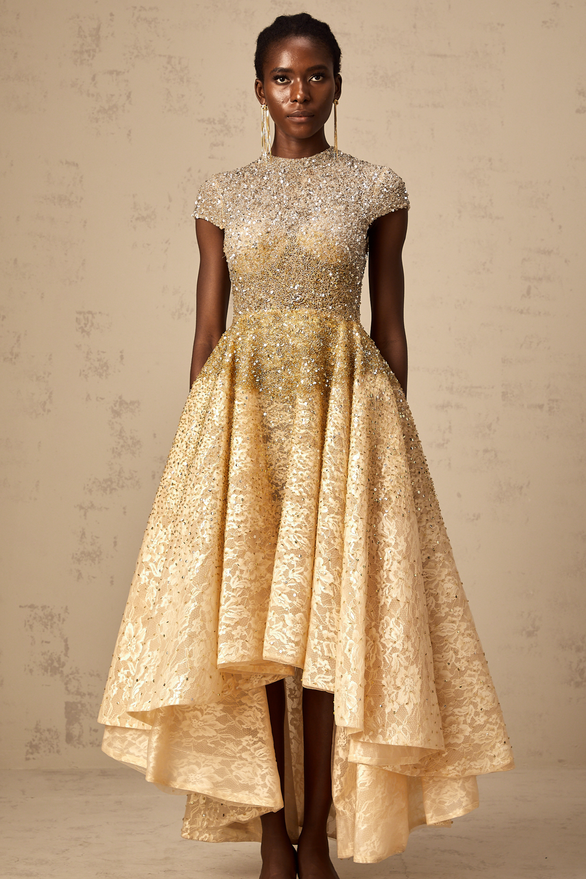 Model 1.77 m boyunda ve M beden giyiyor• Şampanya ve Altın• Dantel üst katman• Yuvarlak yaka• Kısa kollu• Boncuk süsleme• Payet süslemesi• Kloş etek• Yüksek-alçak etek• Arka fermuarlı• Kompozisyon: %100 Polyester