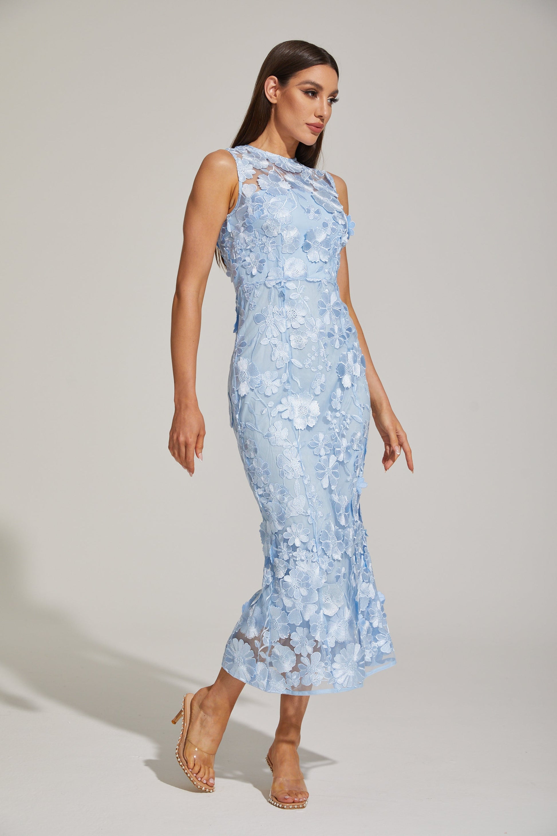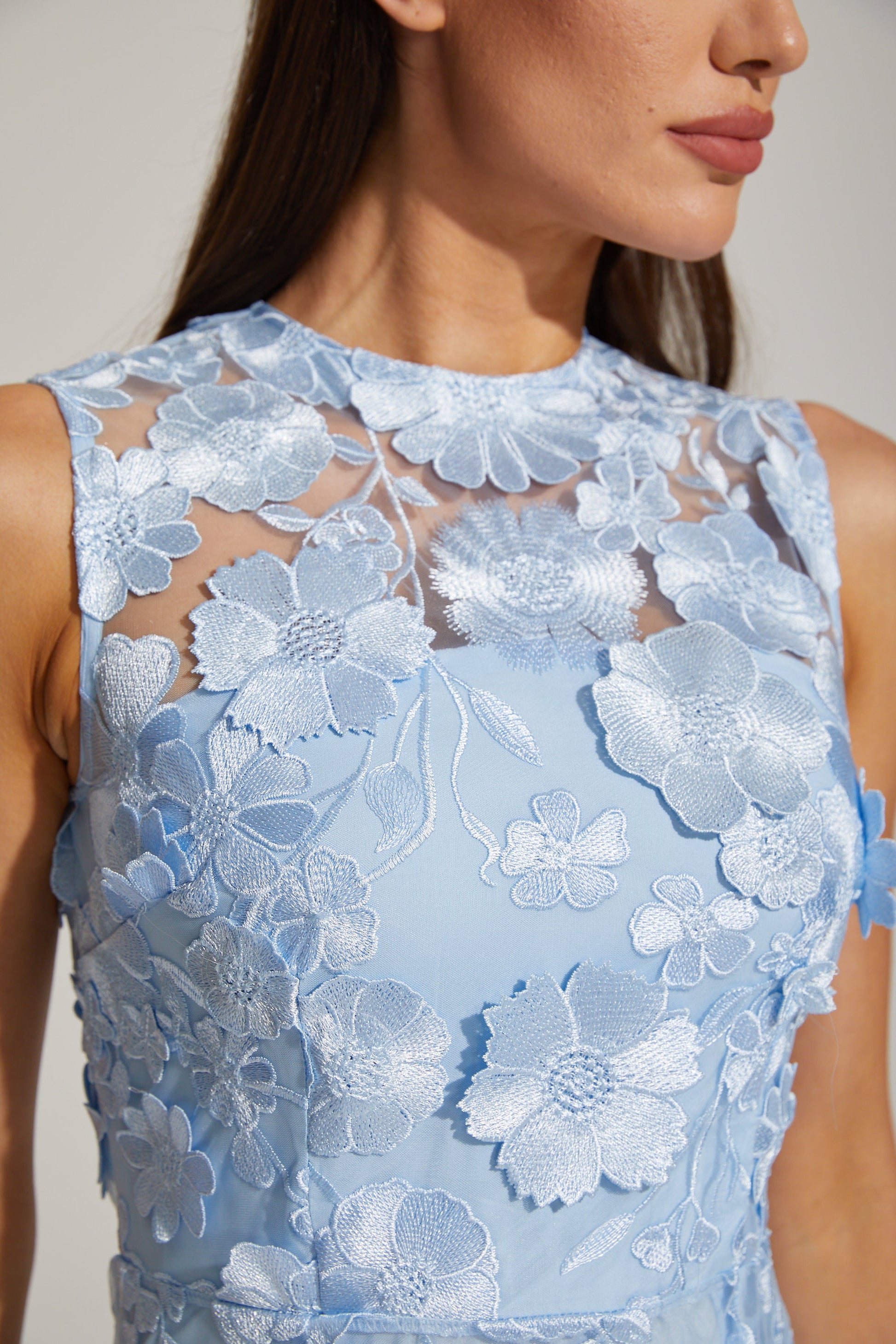 Herta Mavi Çiçekli Dantel Midi Elbise zarafet saçıyor. Yumuşak mavi rengi, yüksek yakalı ve kolsuz tasarımıyla rüya gibi. İnce çiçekli danteller elbiseyi kaplayarak doku ve romantizm katıyor. Midi boy dar kesim silueti, vücudu sararak düğünler veya partiler gibi yarı resmi etkinlikler için ideal.