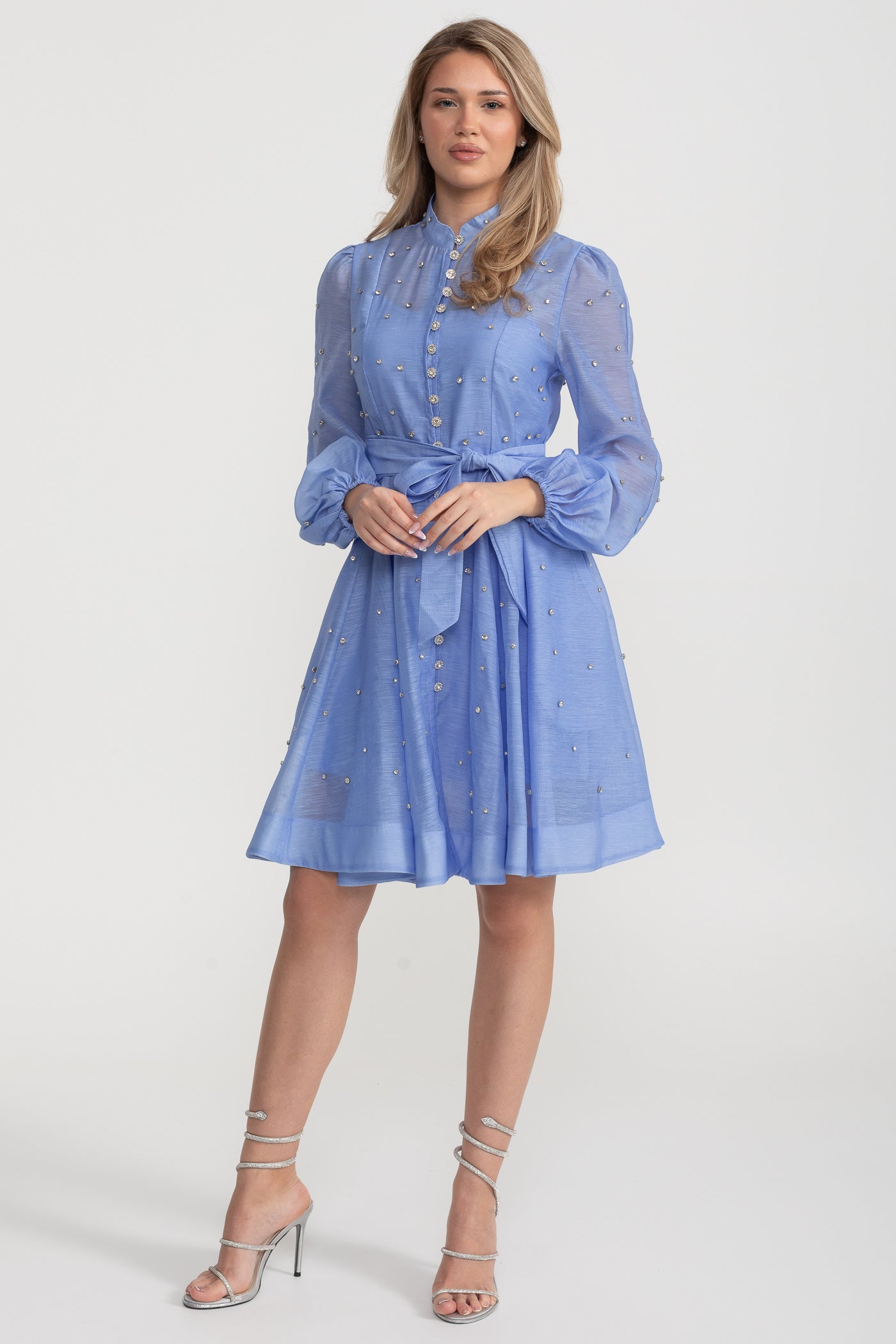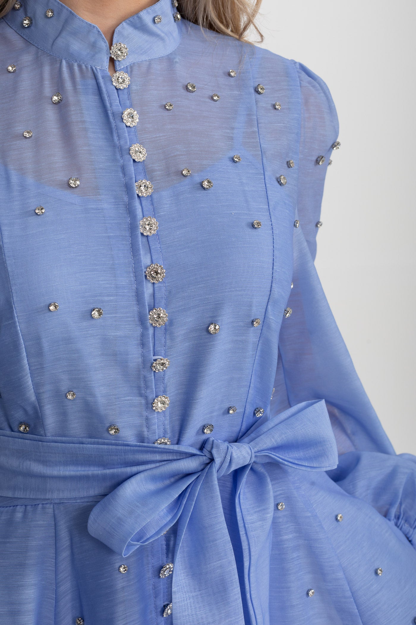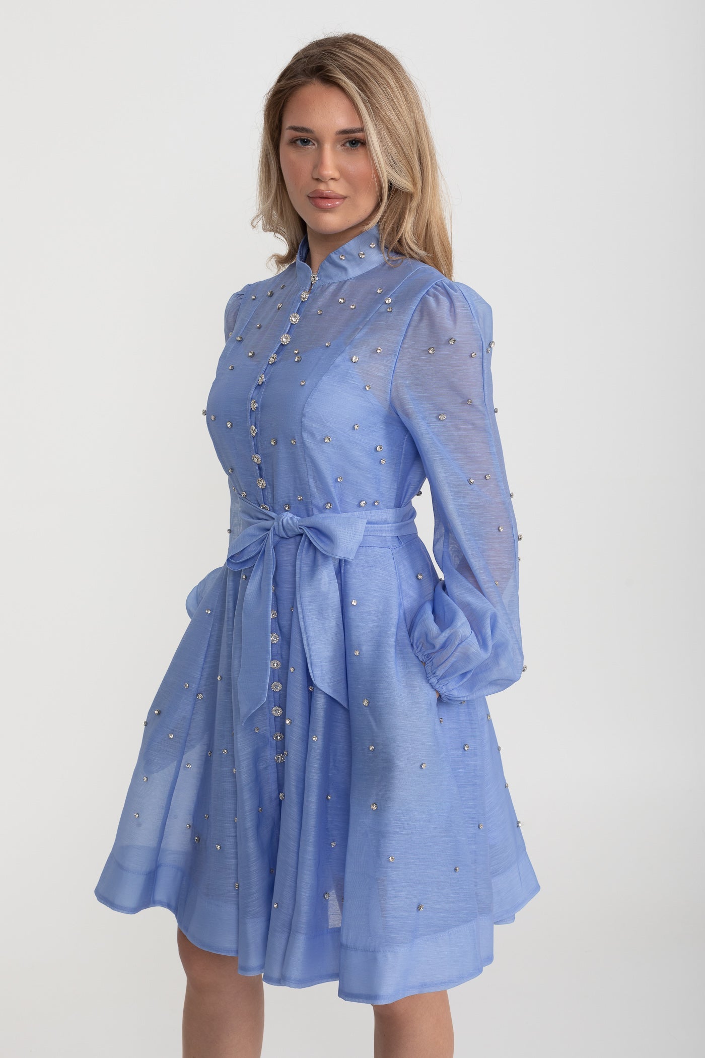Kristal Süslemeli Uzun Kollu Mini Elbise - Mavi