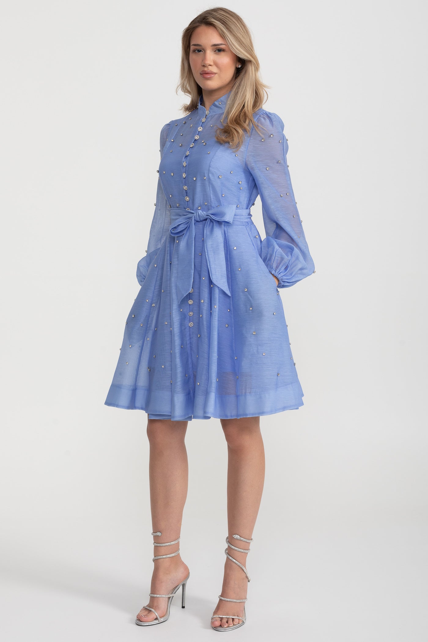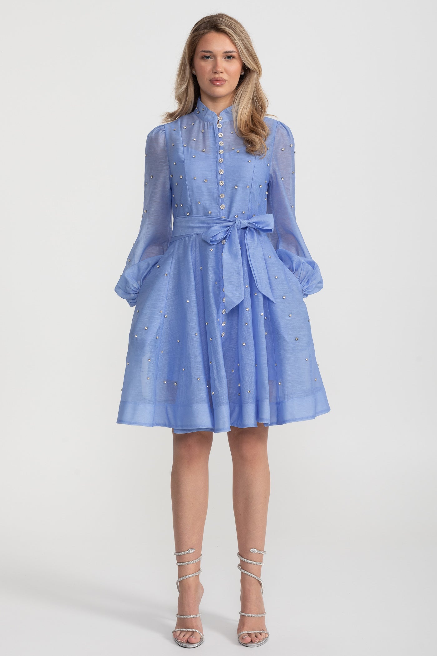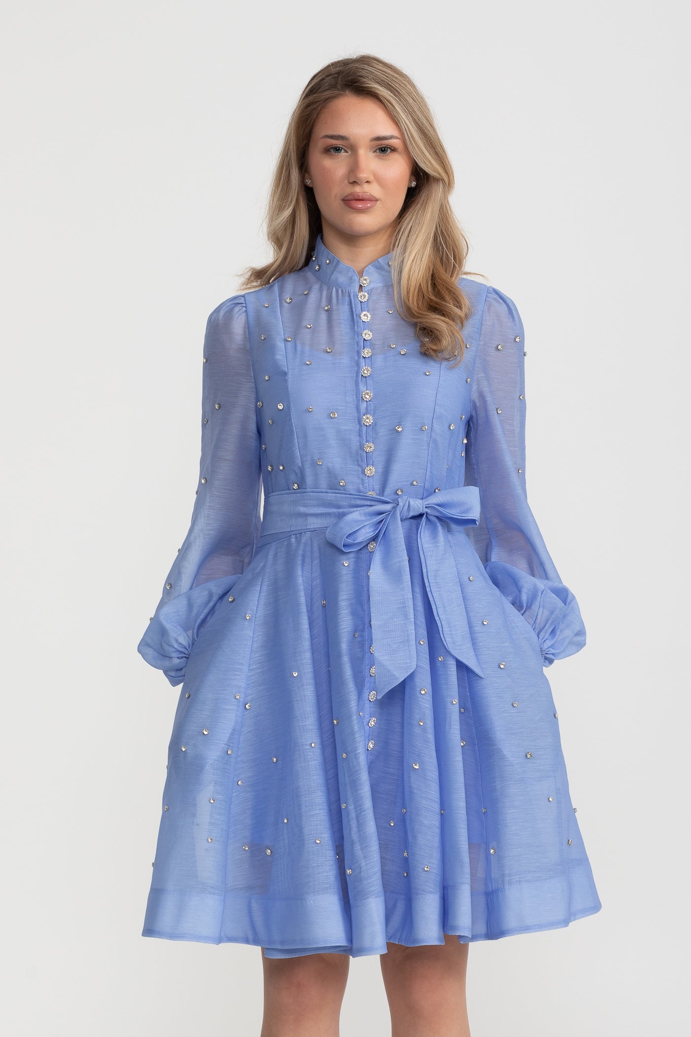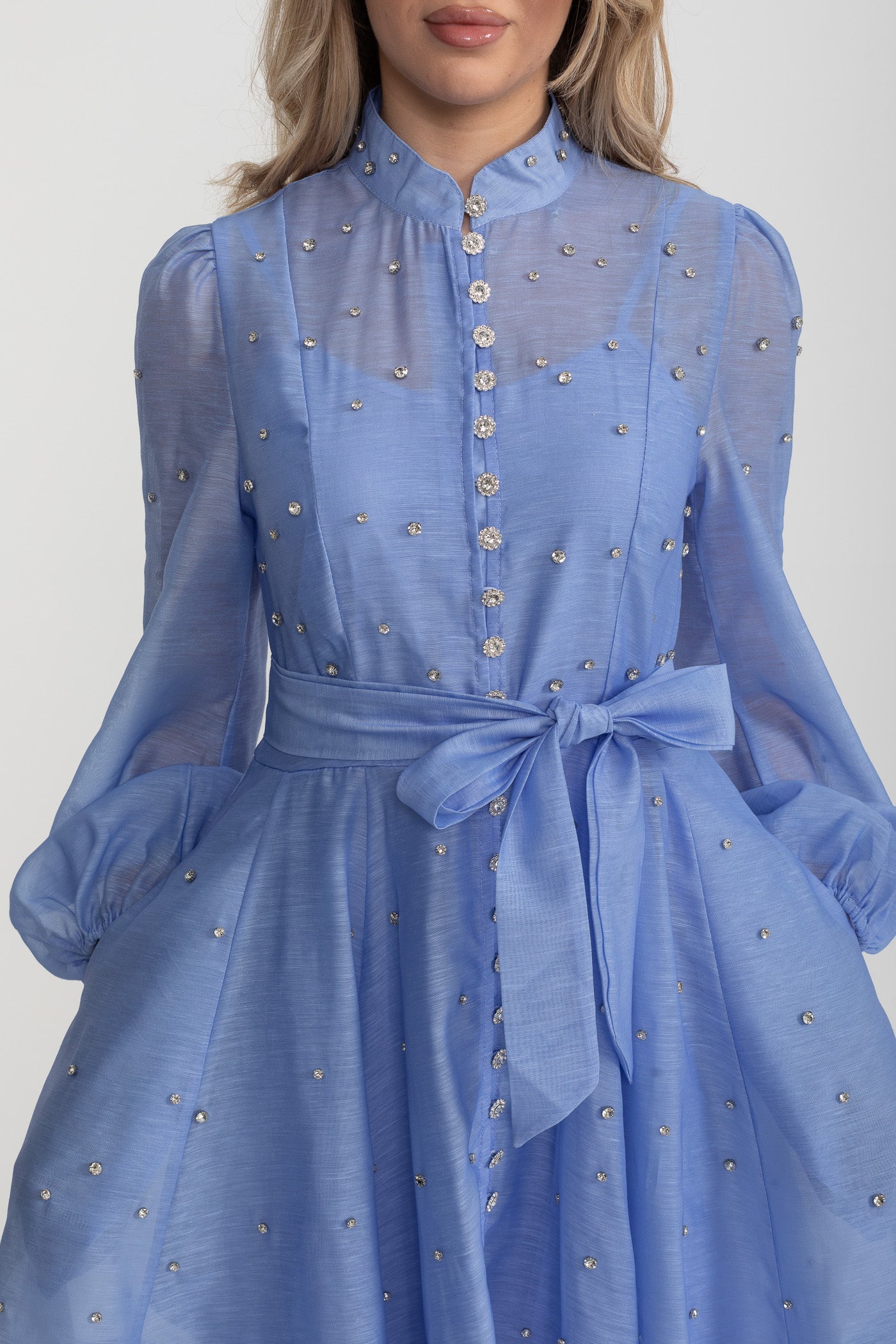 Kristal Süslemeli Uzun Kollu Mini Elbise - Mavi