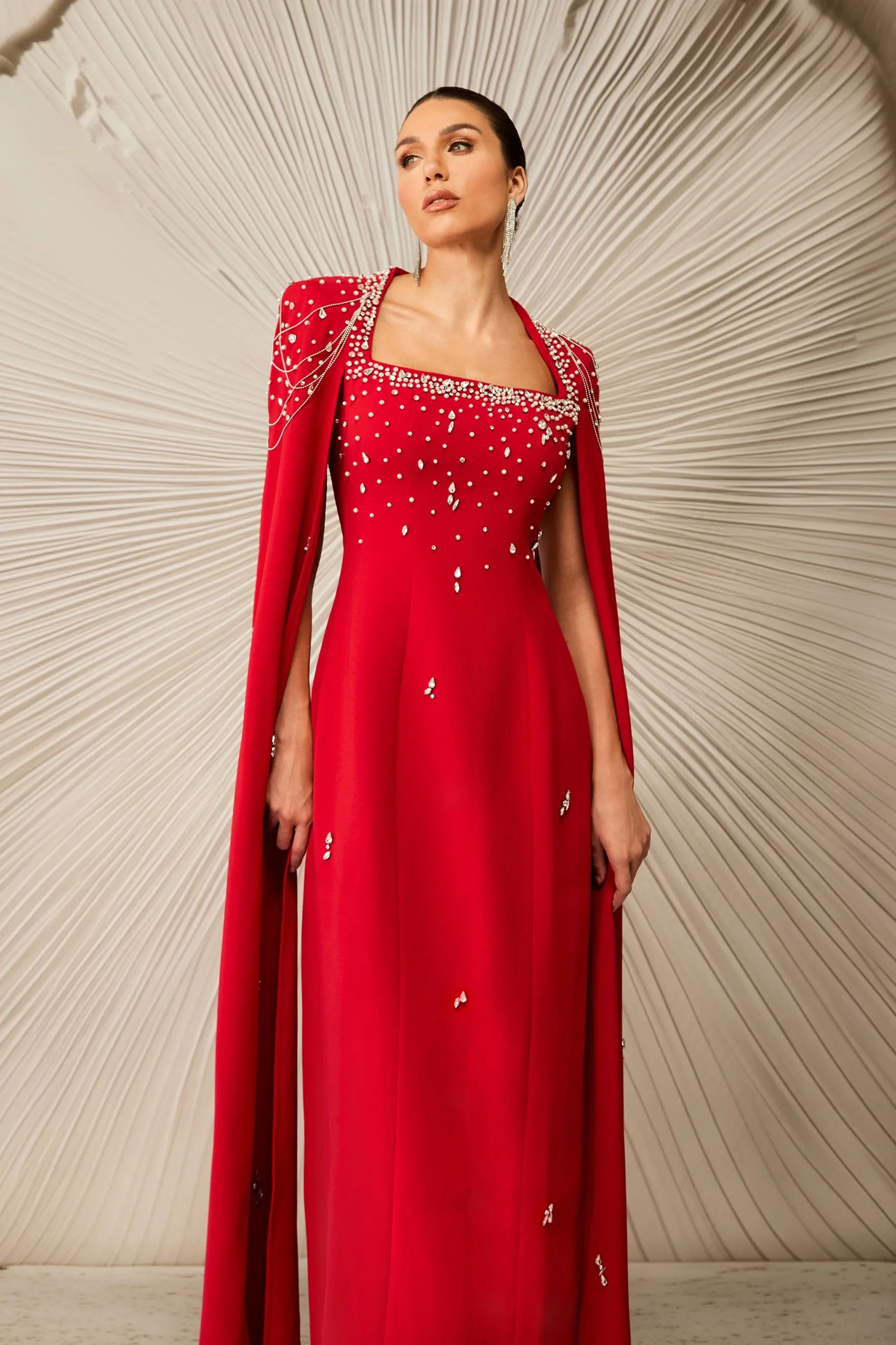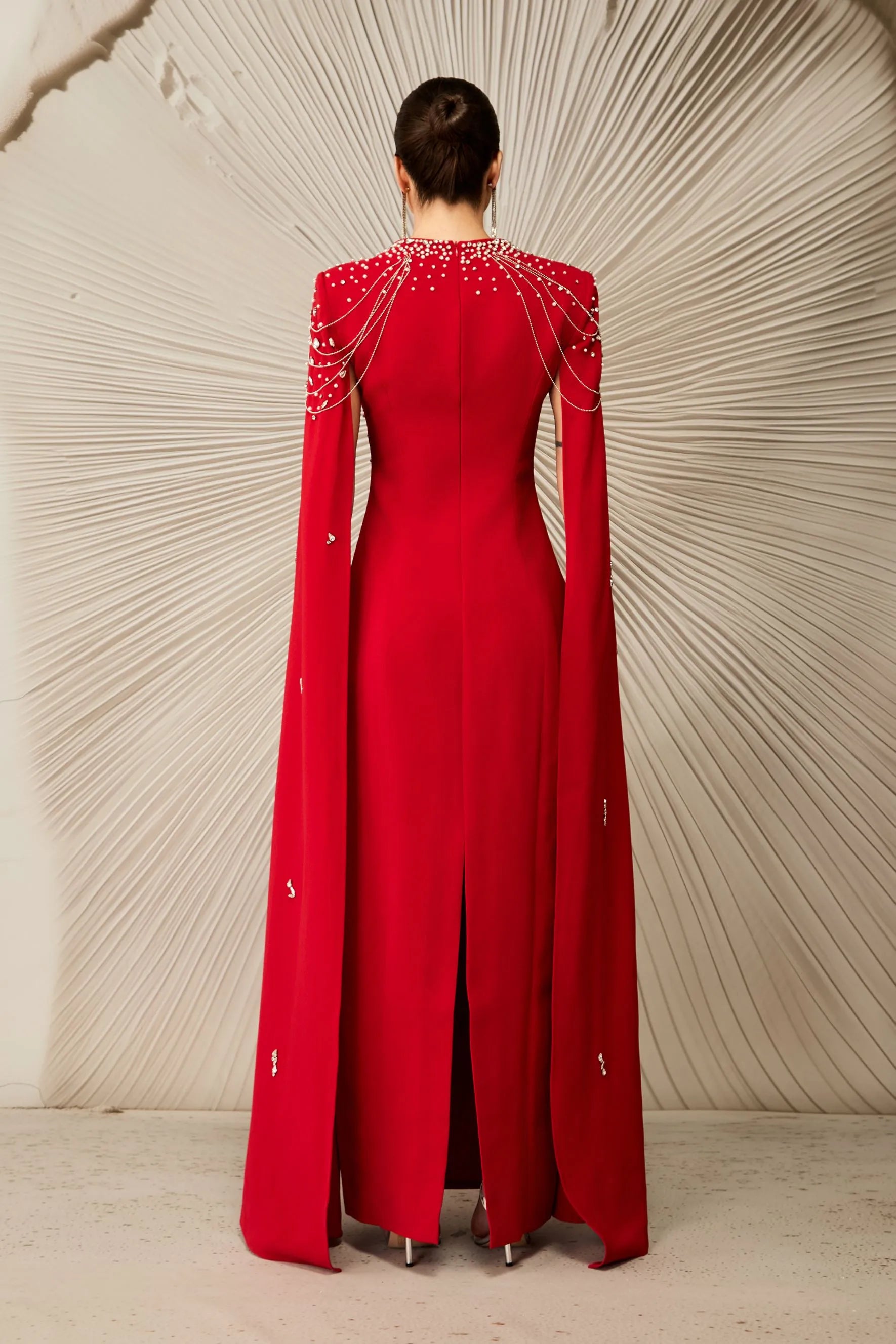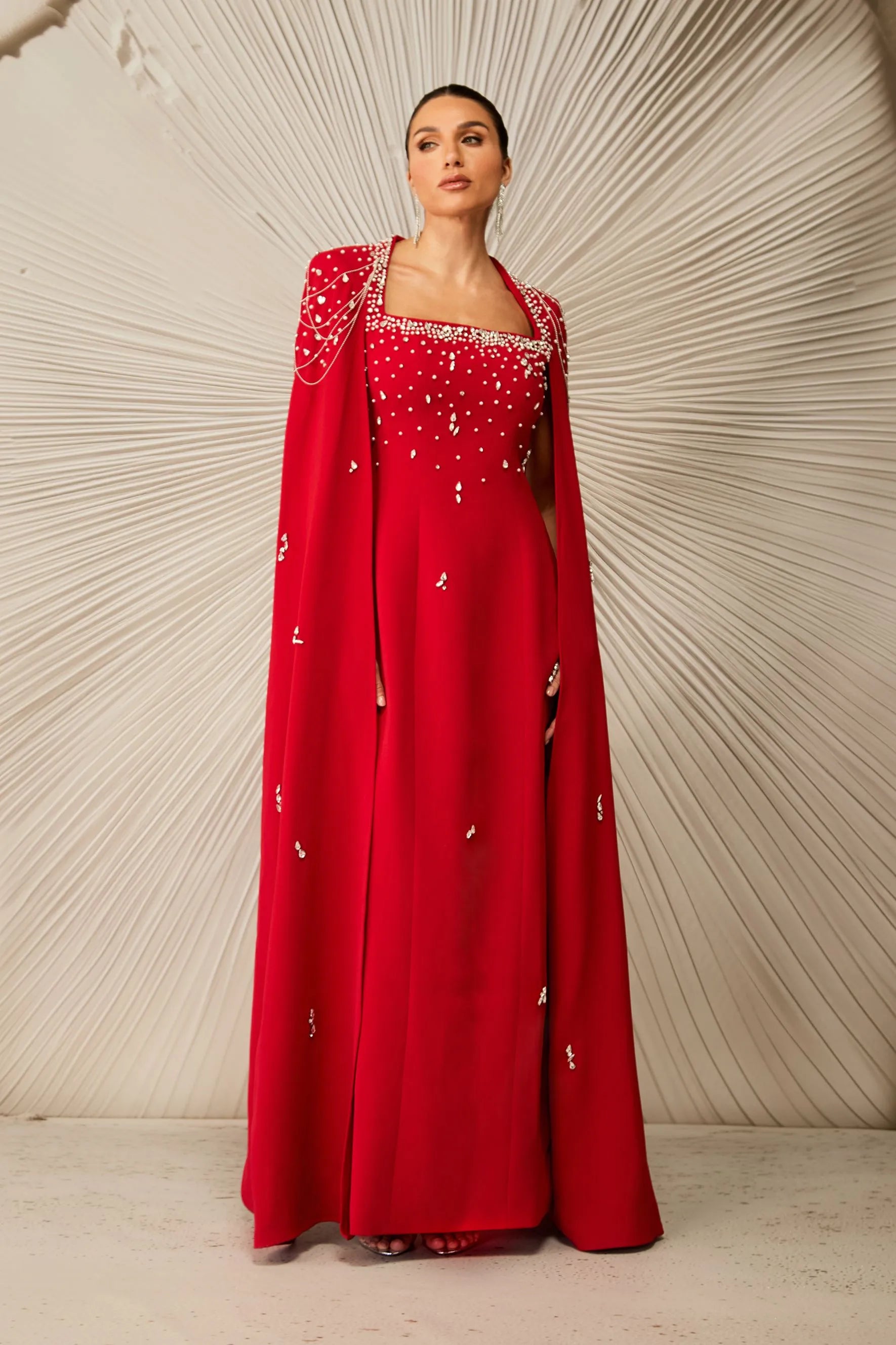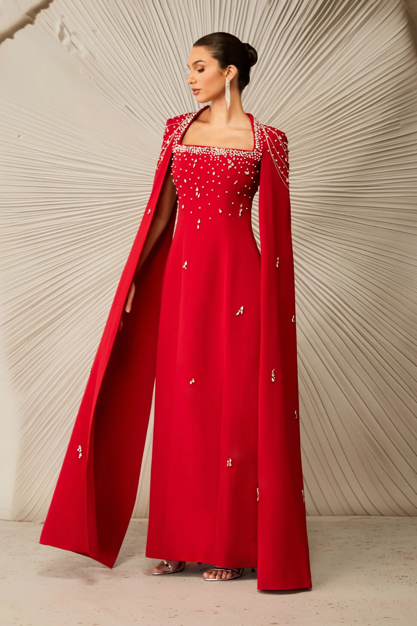Kırmızı Kristal İşlemeli Pelerin Kollu Maksi Elbise,