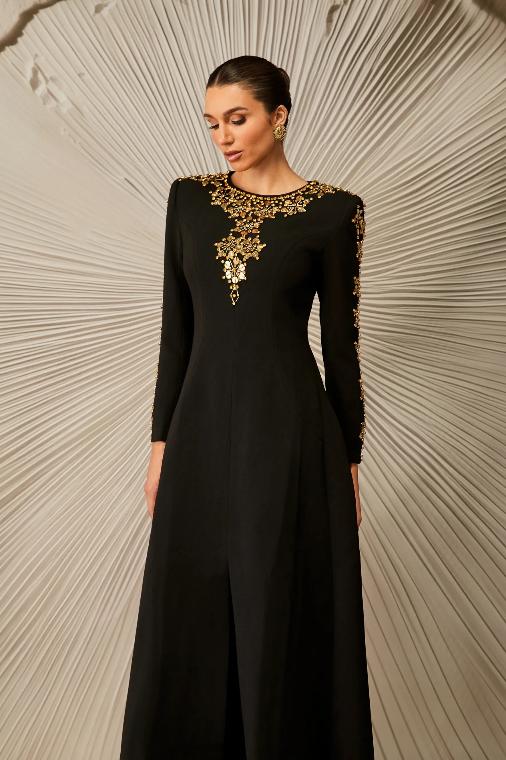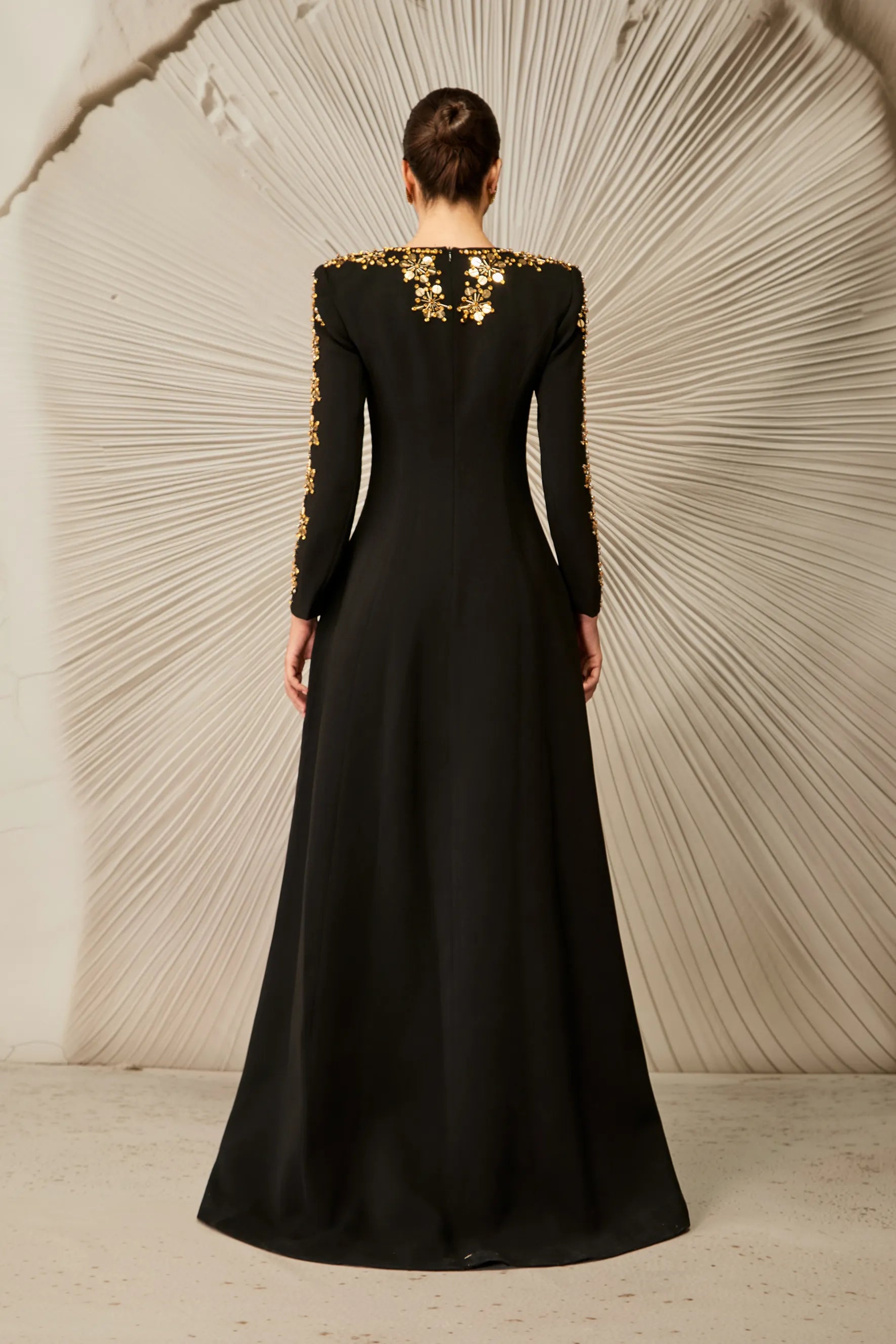Bu çarpıcı siyah elbise, A kesim silueti ve zarif uzun kolları ile dikkat çekiyor. Yaka ve manşetlerde karmaşık altın süslemeler yer alıyor.